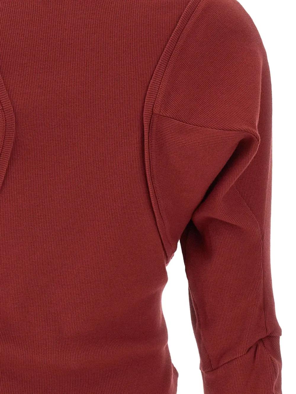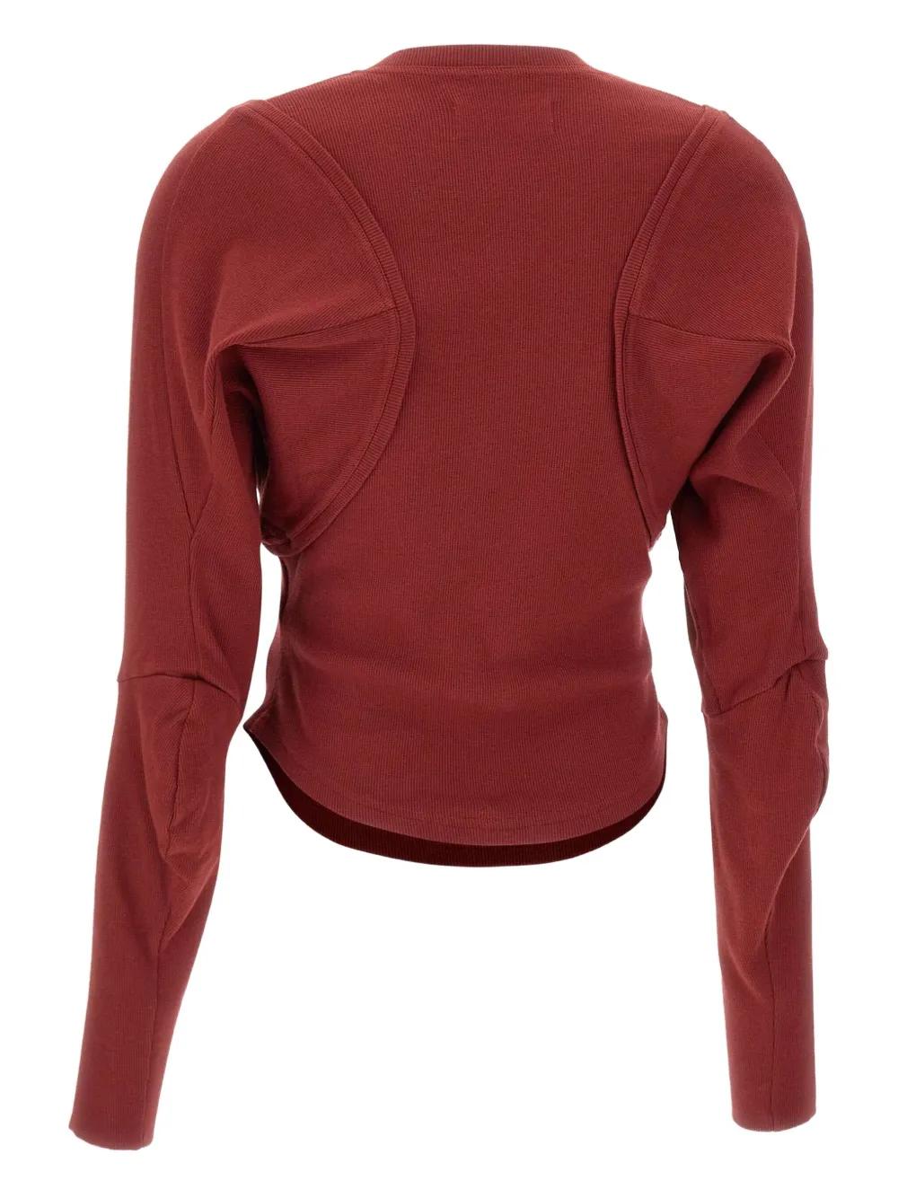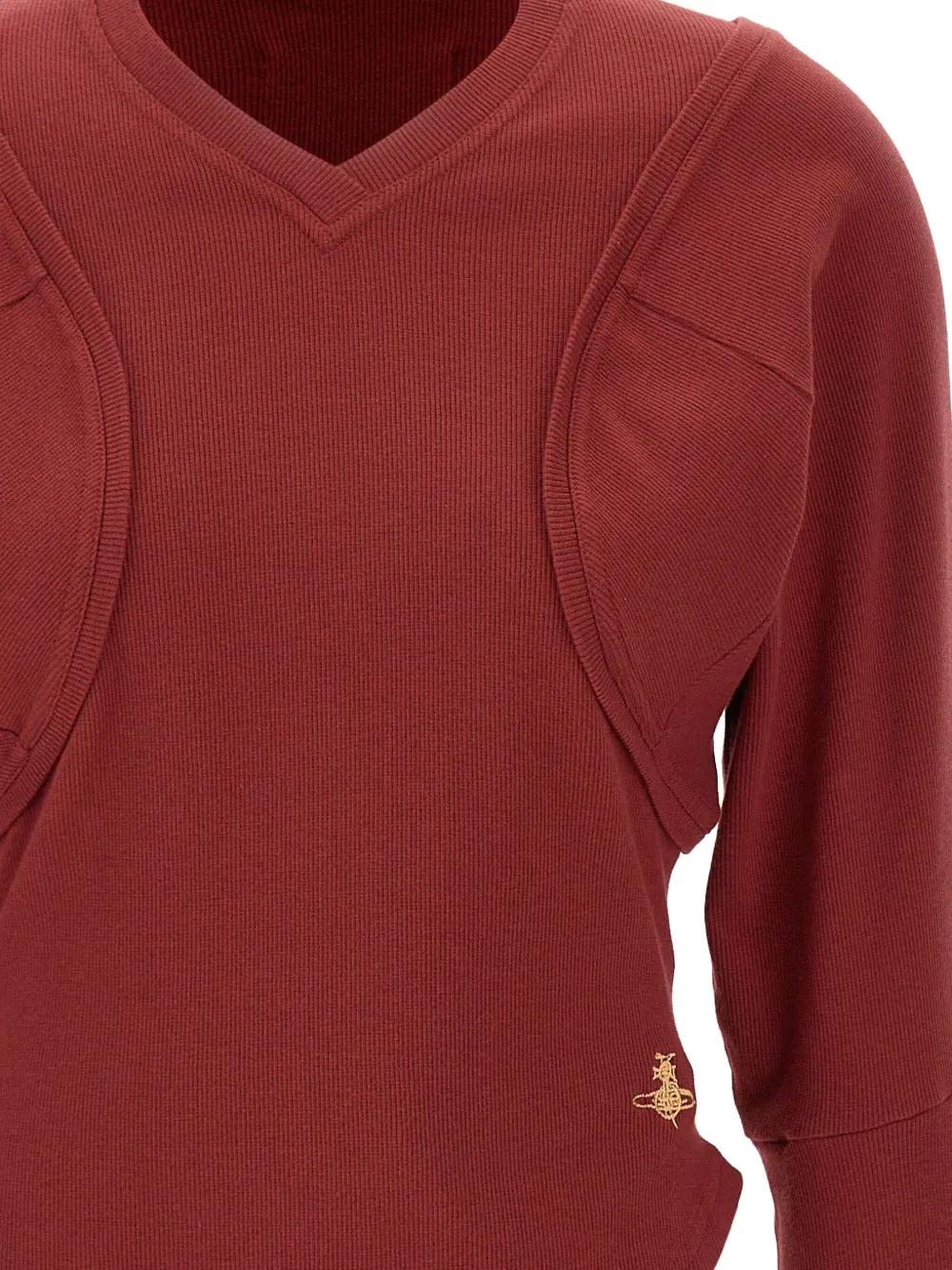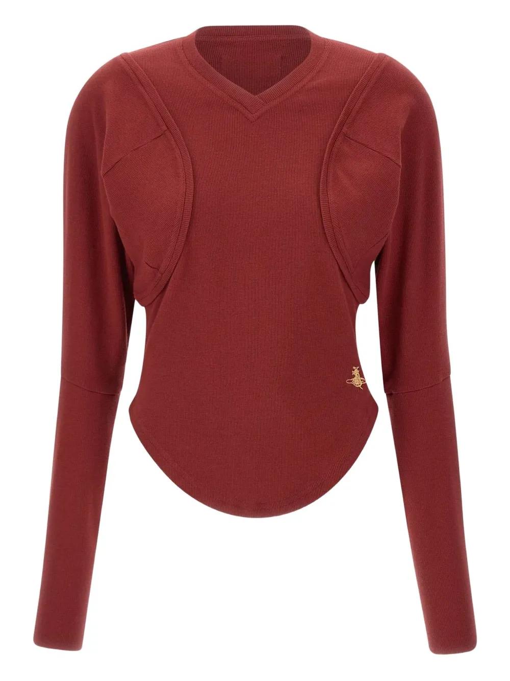 cherry red ribbed knit V-neck long sleeves embroidered logo at hem