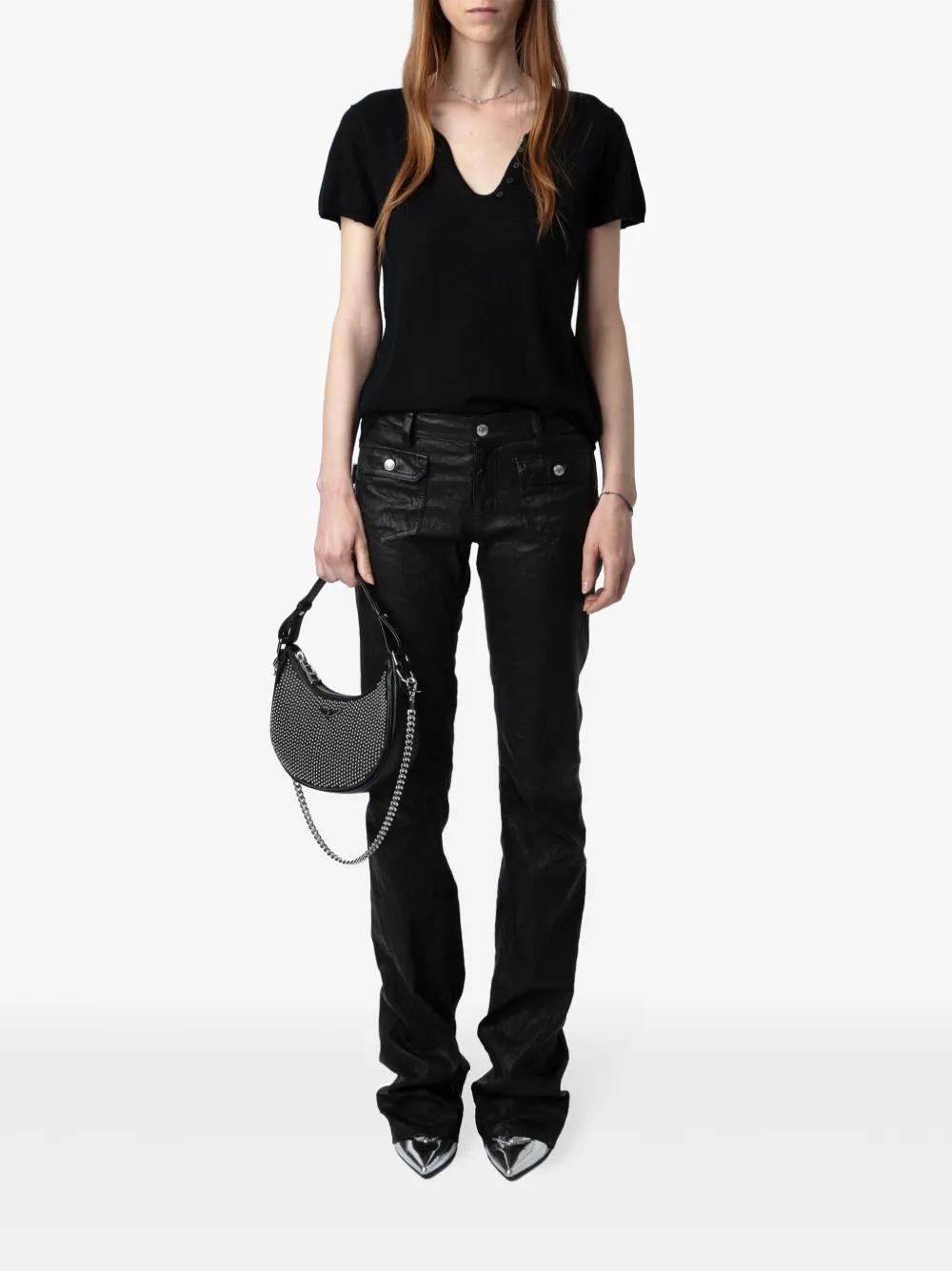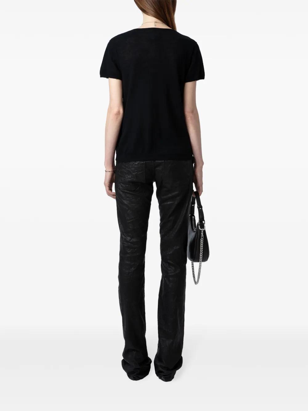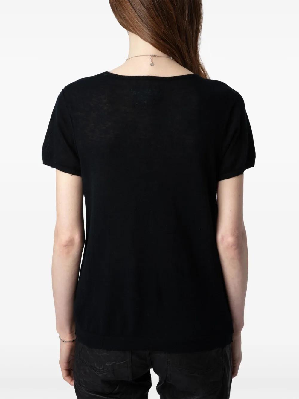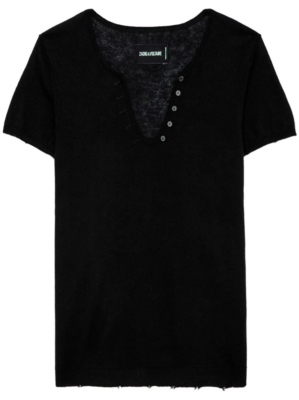 black cashmere fine knit short front button fastening V-neck short sleeves ribbed trim straight hem