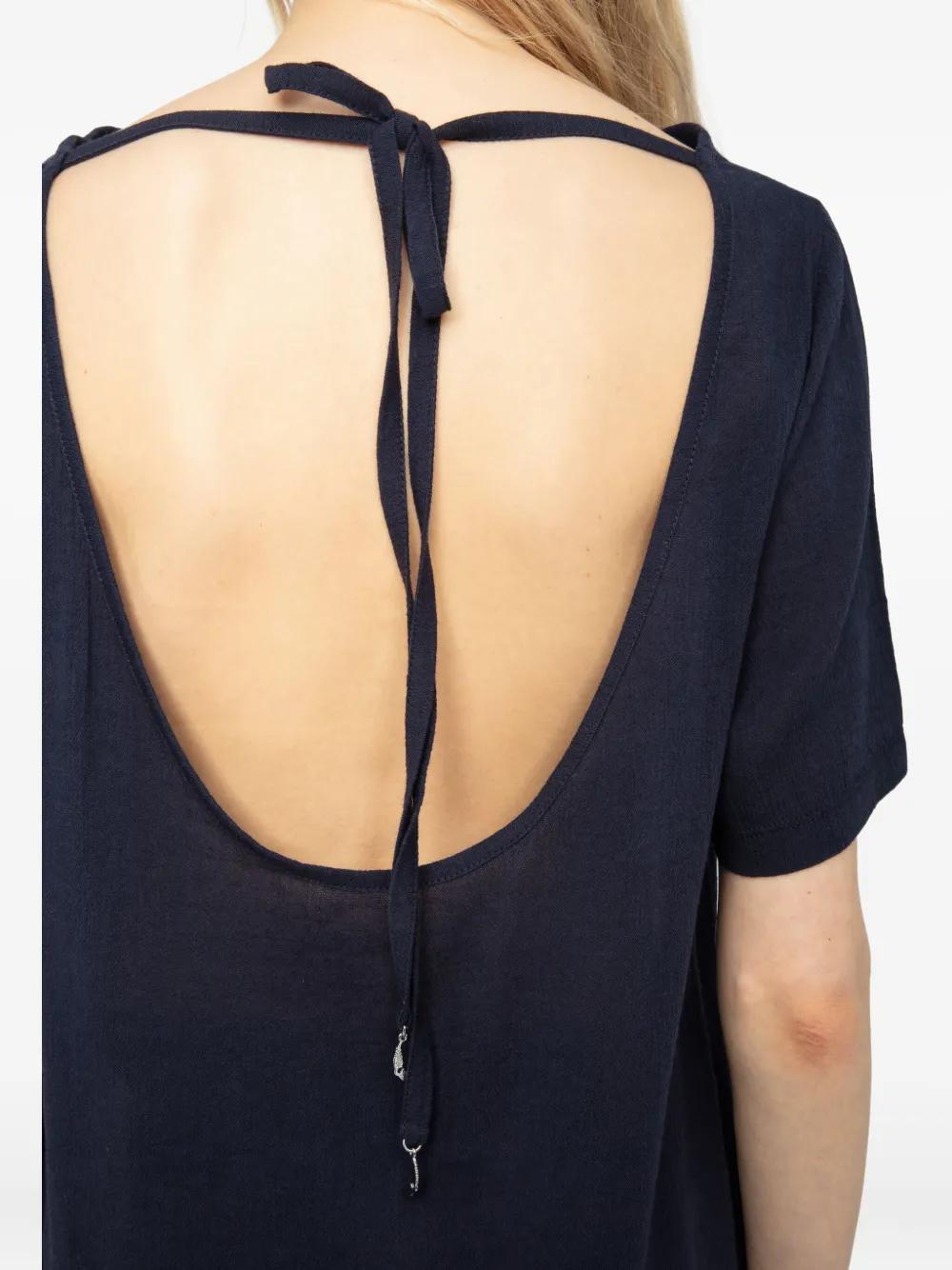navy blue rear tie fastening short sleeves open back straight hem