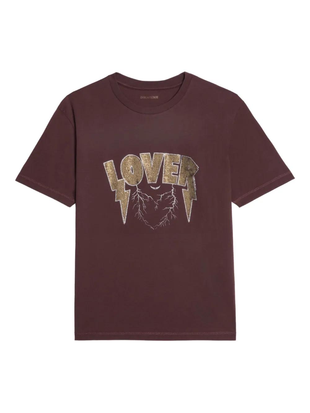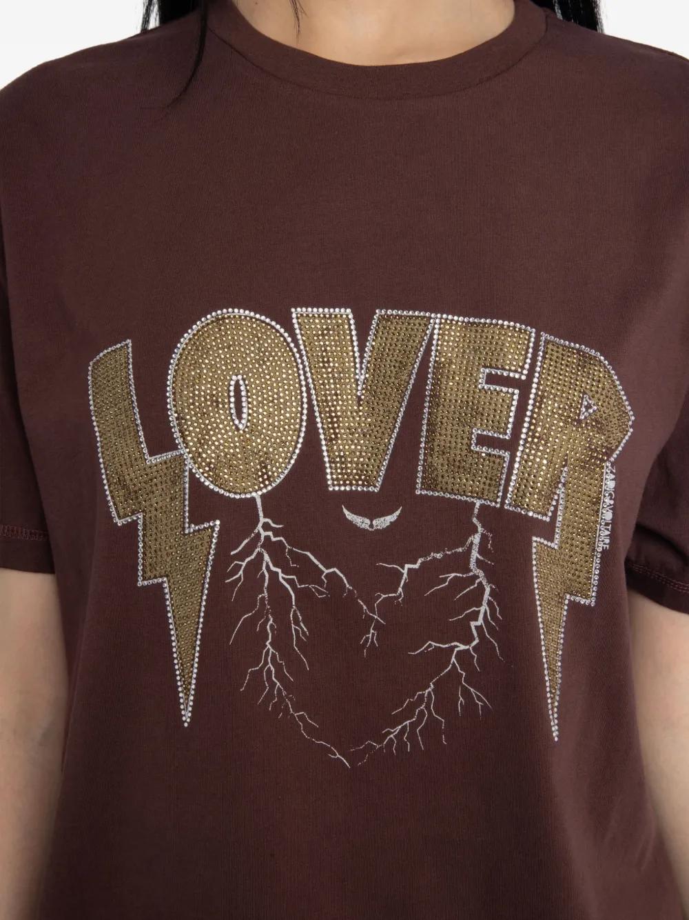 brown rhinestone embellishment graphic print short sleeves crew neck