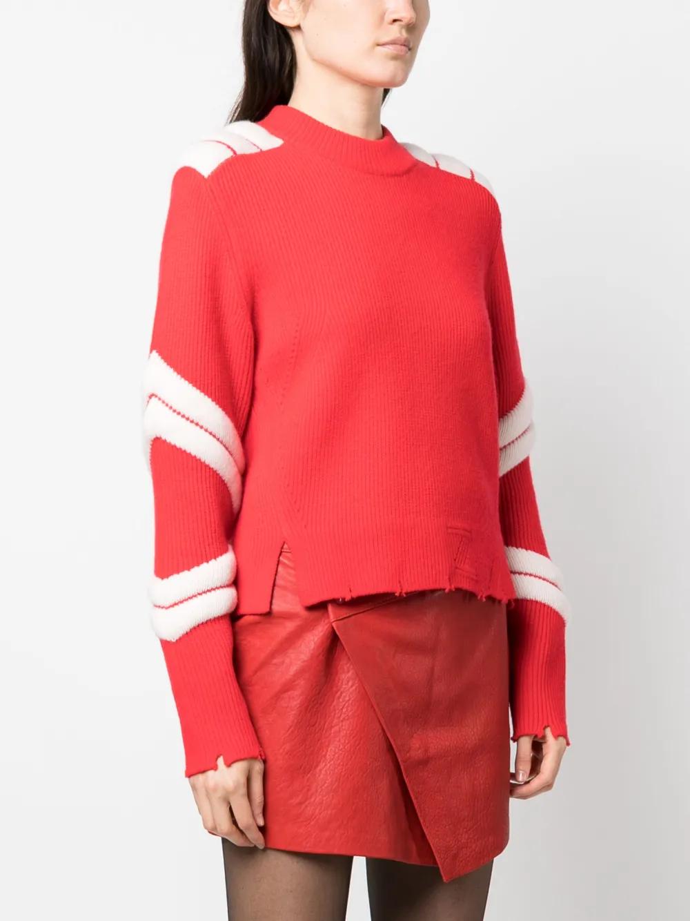 bright red wool ribbed knit distressed finish panelled design short side slits crew neck long sleeves straight hem