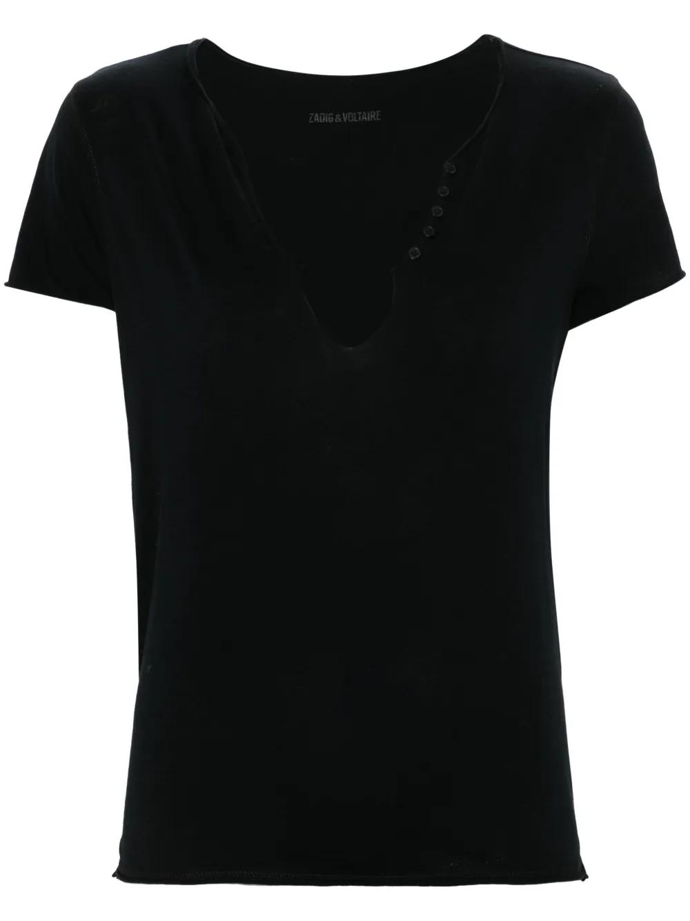 black organic cotton jersey texture V-neck short sleeves rear rhinestone embellished logo raw-cut hem short front button fastening