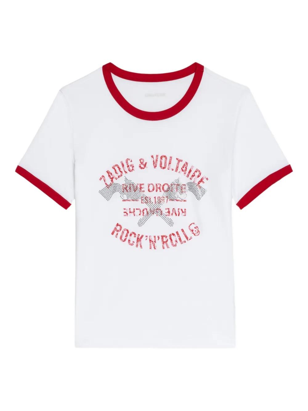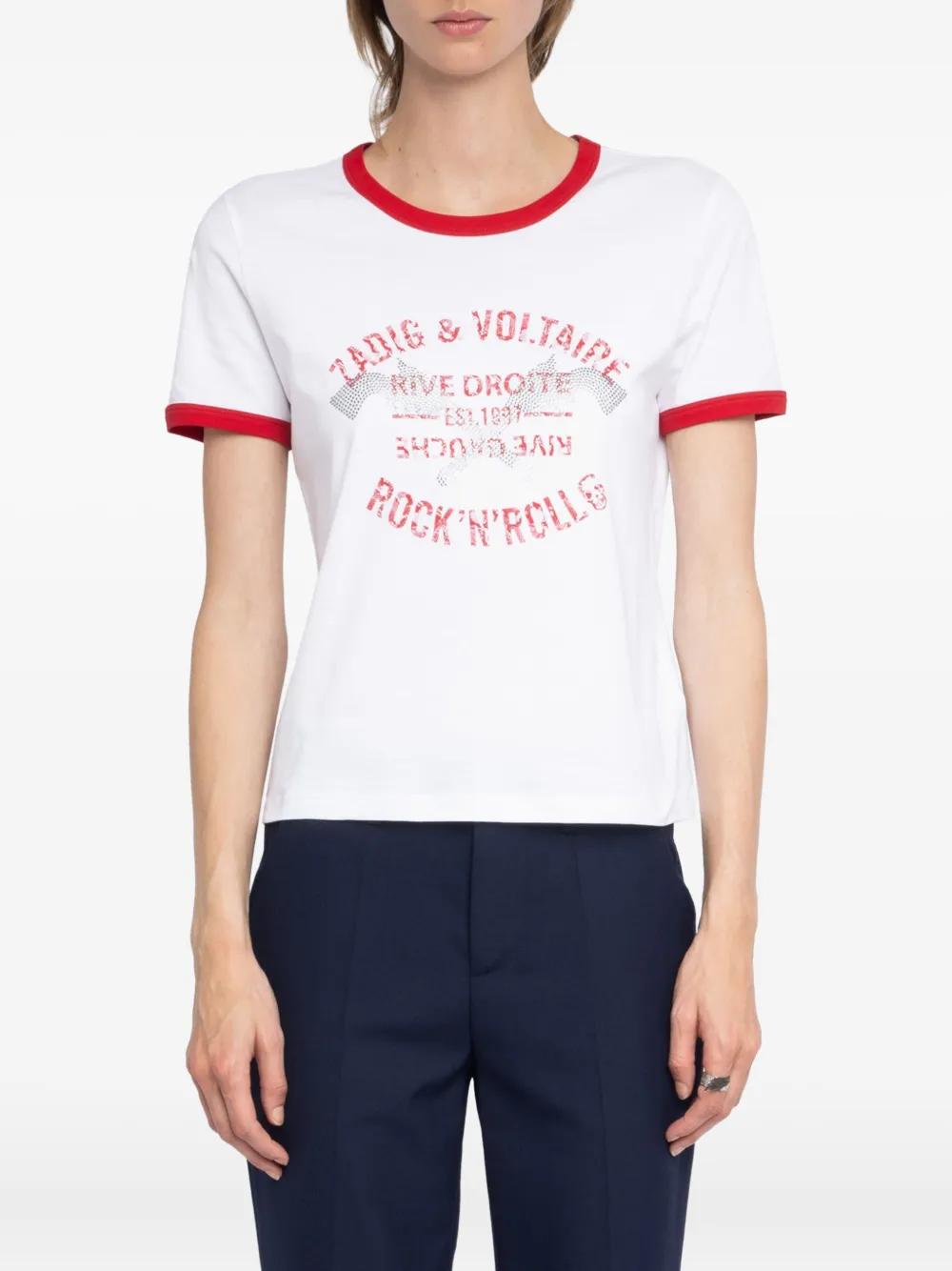 white red trim rhinestone embellishment graphic print short sleeves crew neck