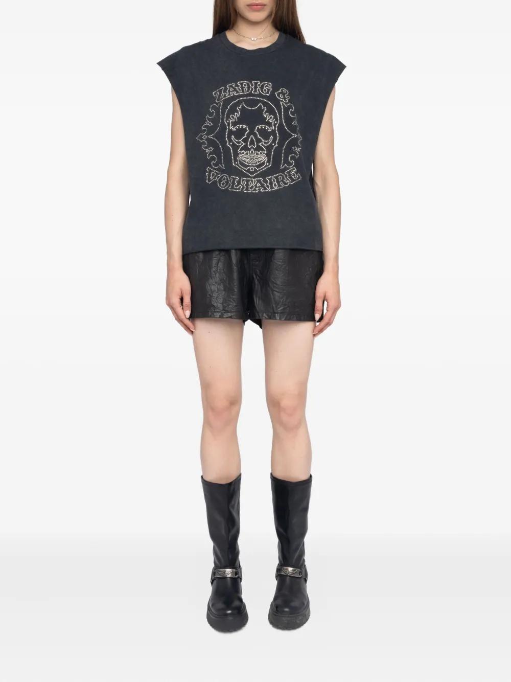 medium grey skull motif strass embellishment cap sleeves raw-cut hem cotton