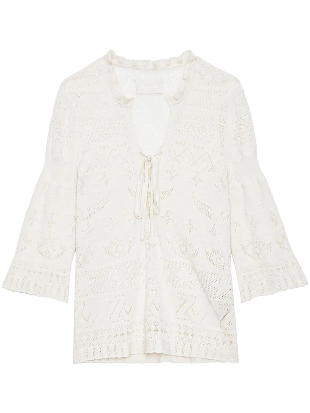 ecru cotton open knit ribbed-knit edge V-neck front lace-up fastening three-quarter length sleeves straight hem
