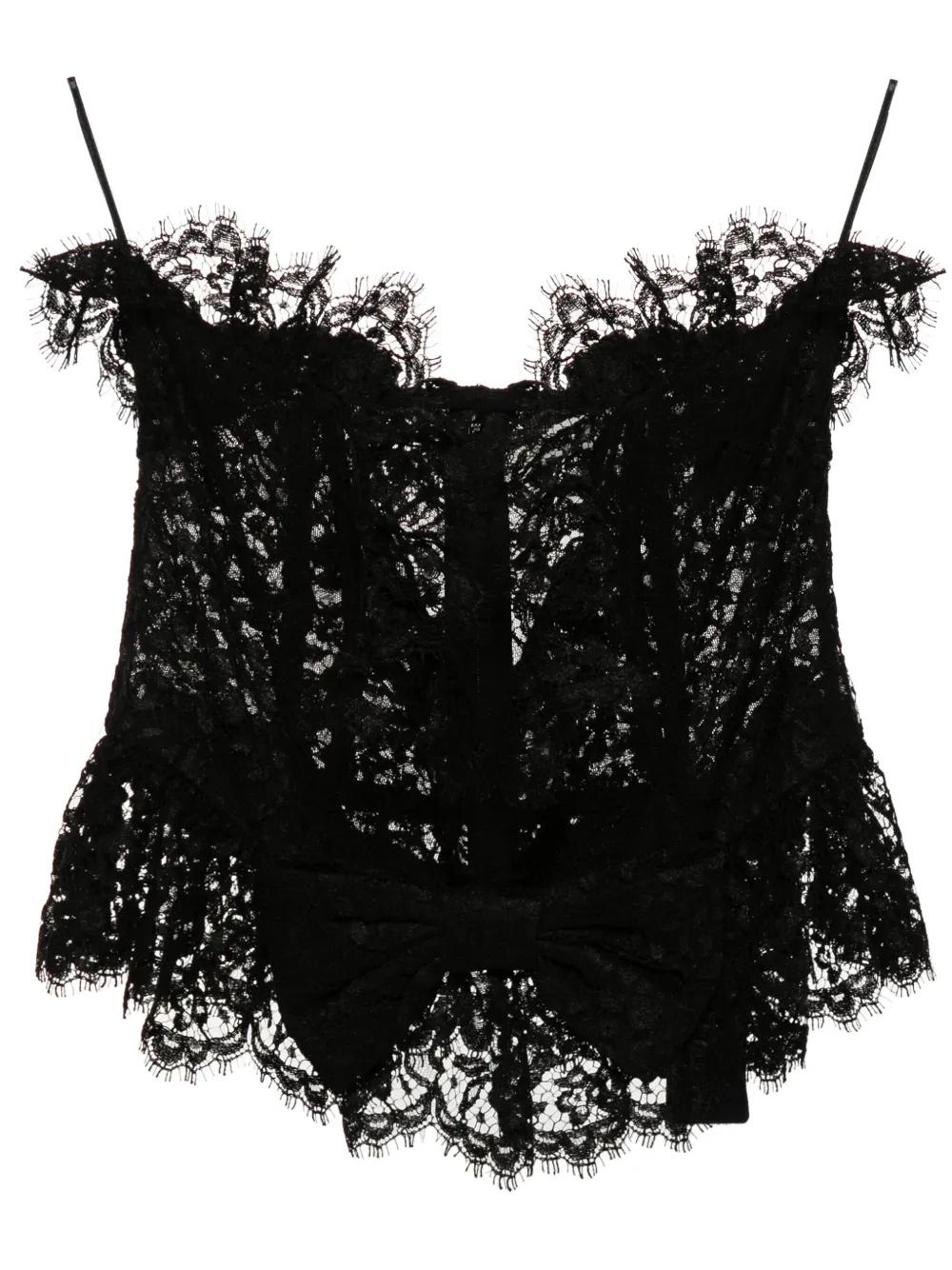 black guipure lace bow detailing bustier-style neckline rear zip fastening strapless boned bodice unlined peplum hem