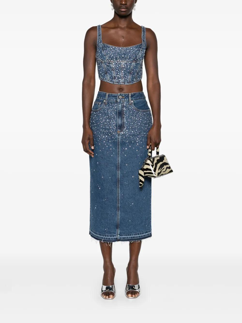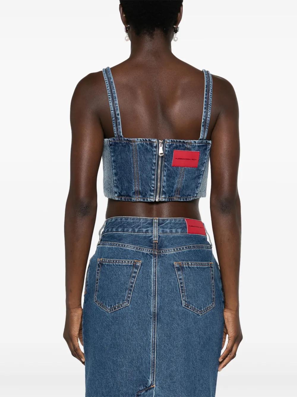 blue cotton denim rhinestone embellishment star stud embellishment seam detailing bustier-style neckline boned bodice rear zip fastening sleeveless straight hem cropped