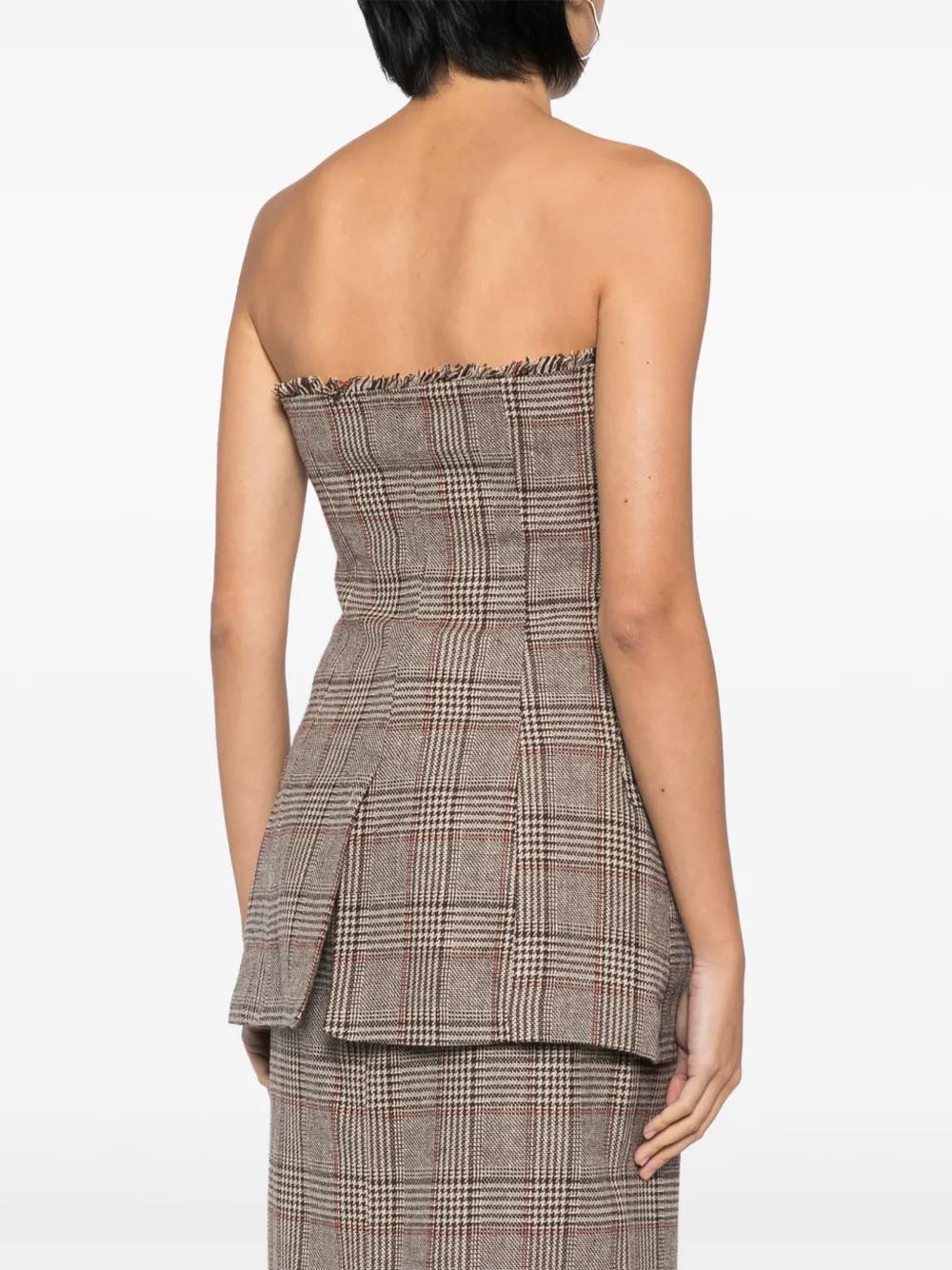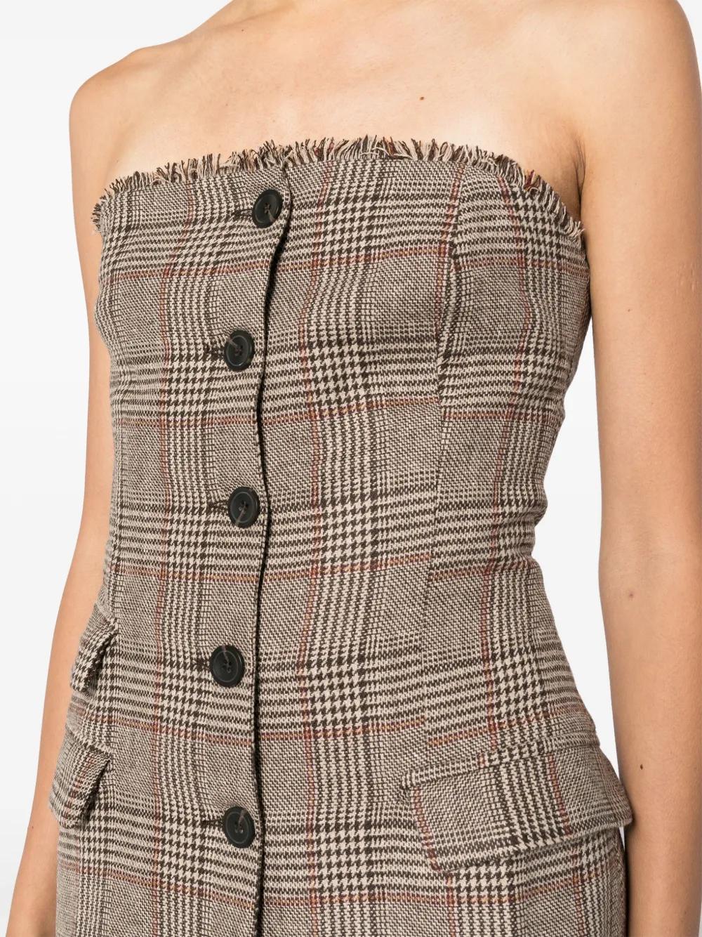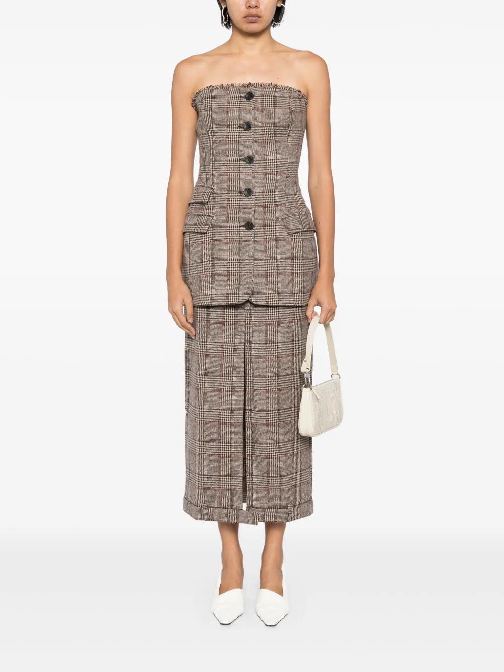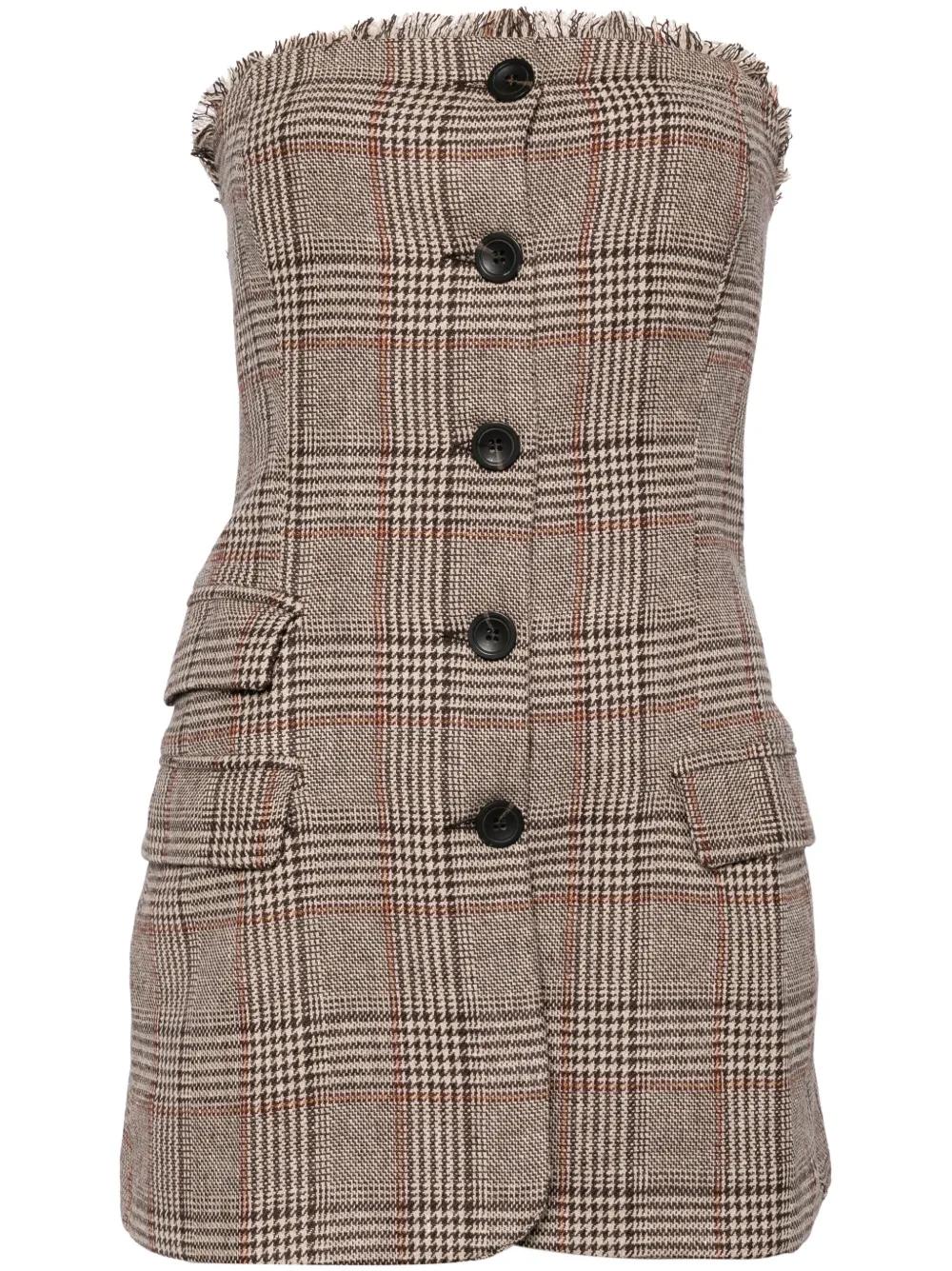 dark brown/multicolor wool blend houndstooth pattern strapless front button fastening raw-edge neckline front flap pockets rear central vent full lining straight hem