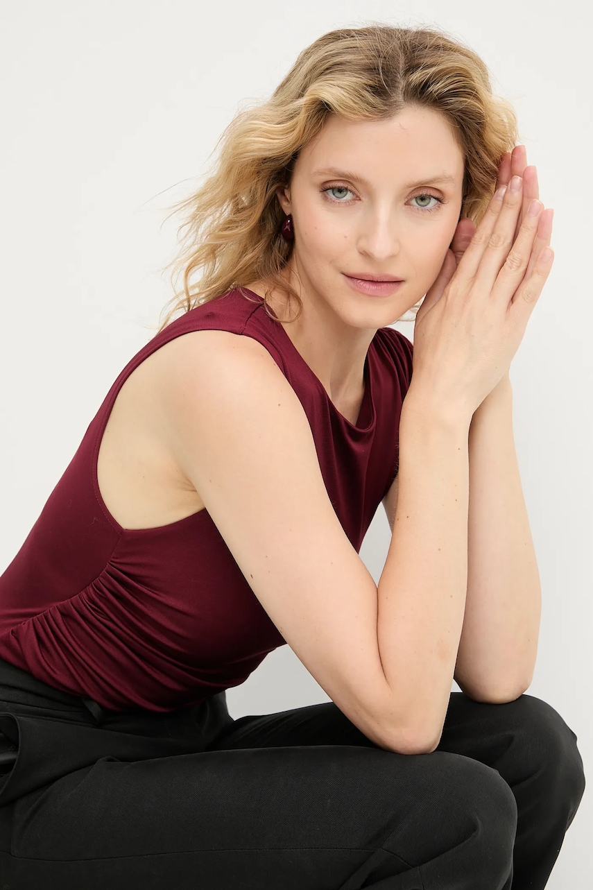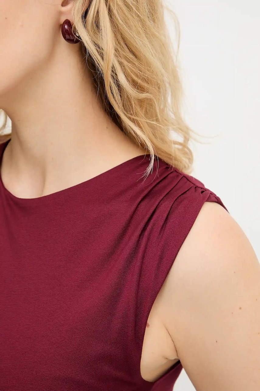 - Dopasowany, podkreślający sylwetkę fason. - Model bez rękawów. - Okrągły dekolt. - Model z ozdobnymi marszczeniami. - Z przodu dodatkowa warstwa materiału w postaci podszewki. - Zapięcie w kroku na zatrzaski dla pełnej funkcjonalności. - Długość: 67 cm. - Szerokość pod pachami: 34 cm. - Wymiary podane dla rozmiaru: S.