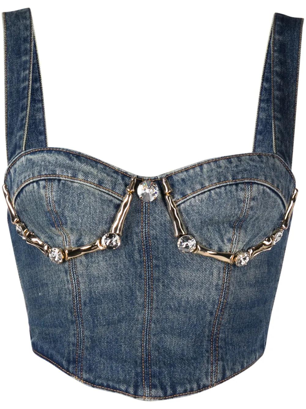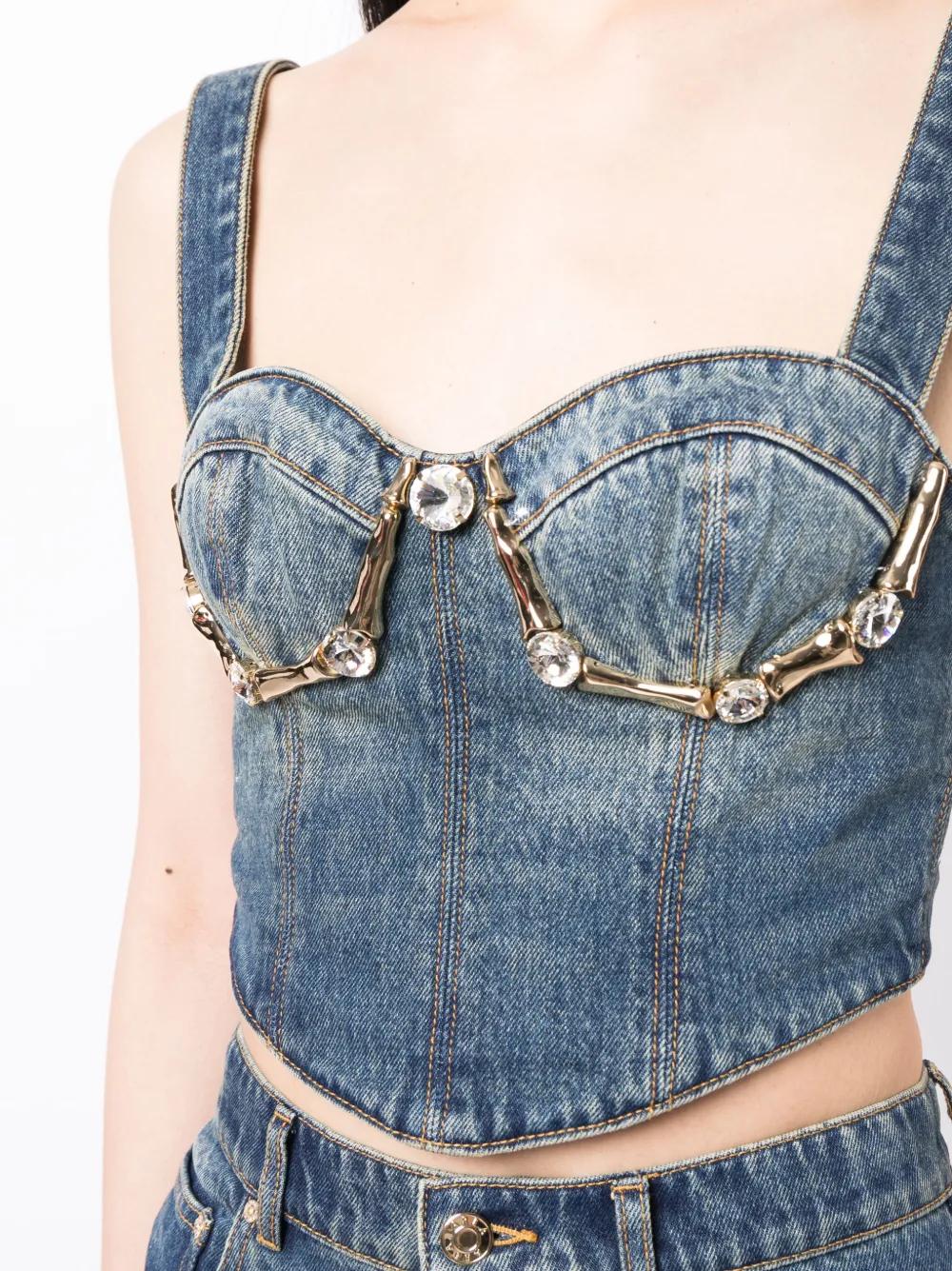 indigo blue cotton blend denim crystal embellishment gold-tone hardware adjustable shoulder straps rear zip fastening bustier-style neckline curved hem cropped