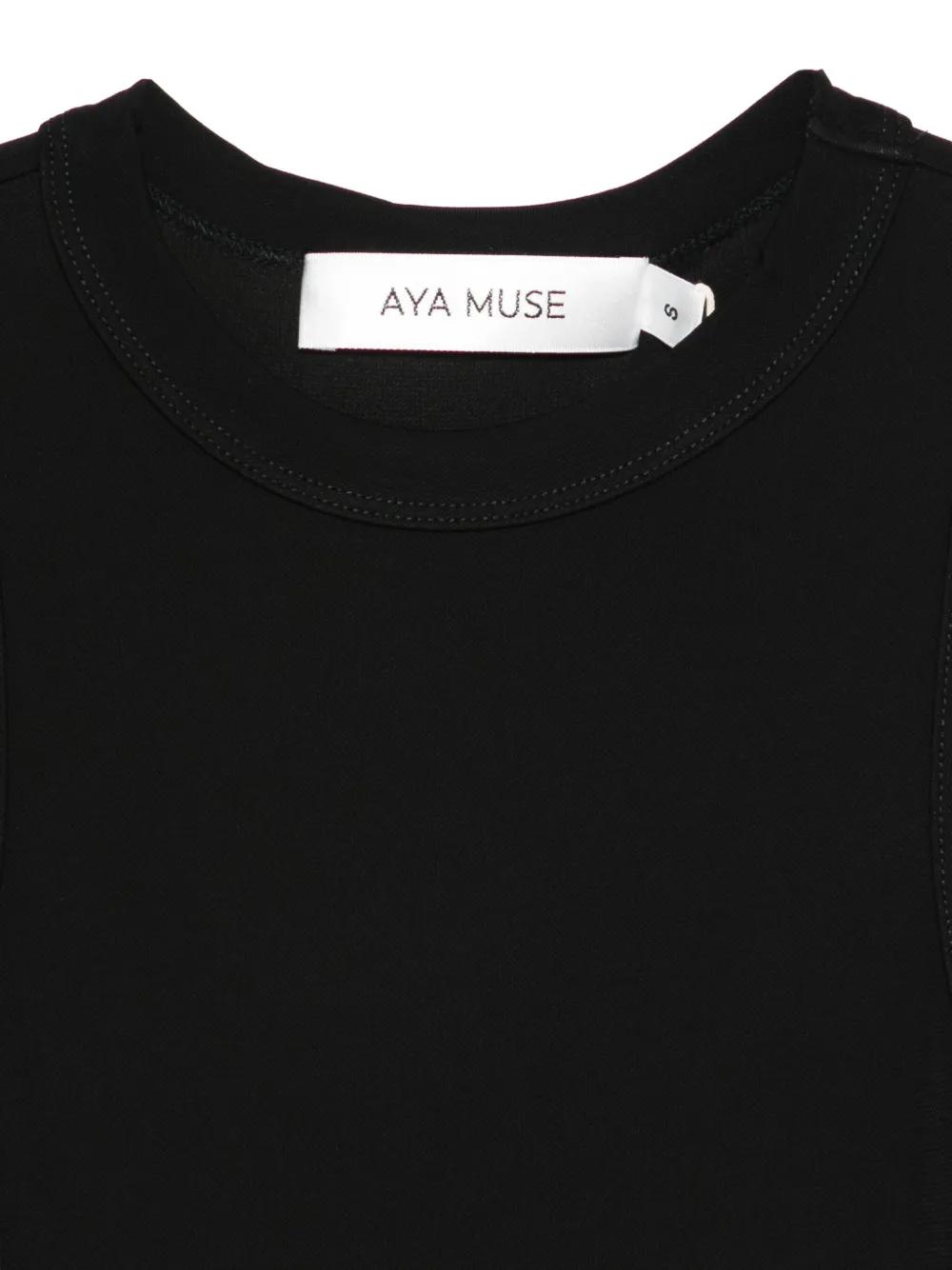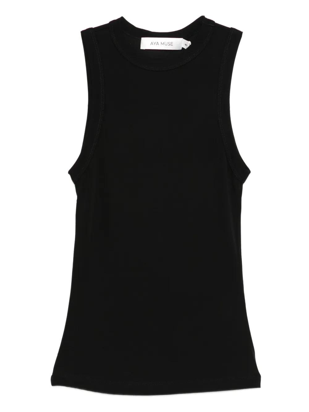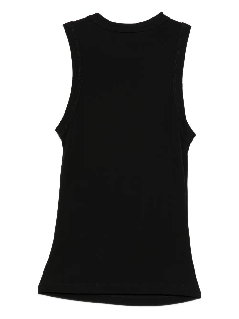 black V-neck wide shoulder straps appliqué logo sleeveless