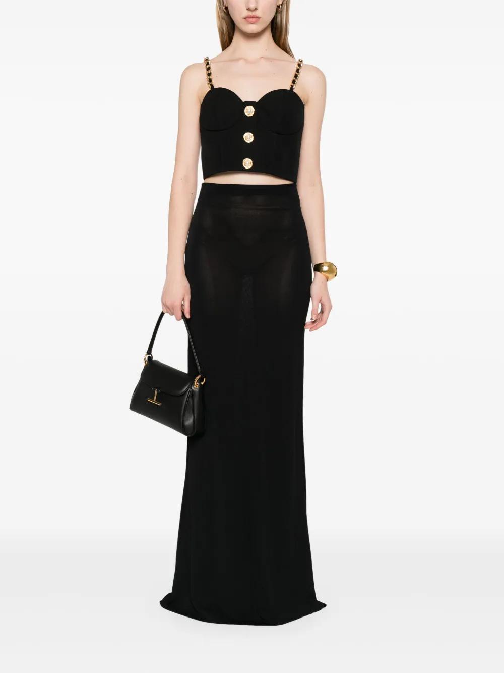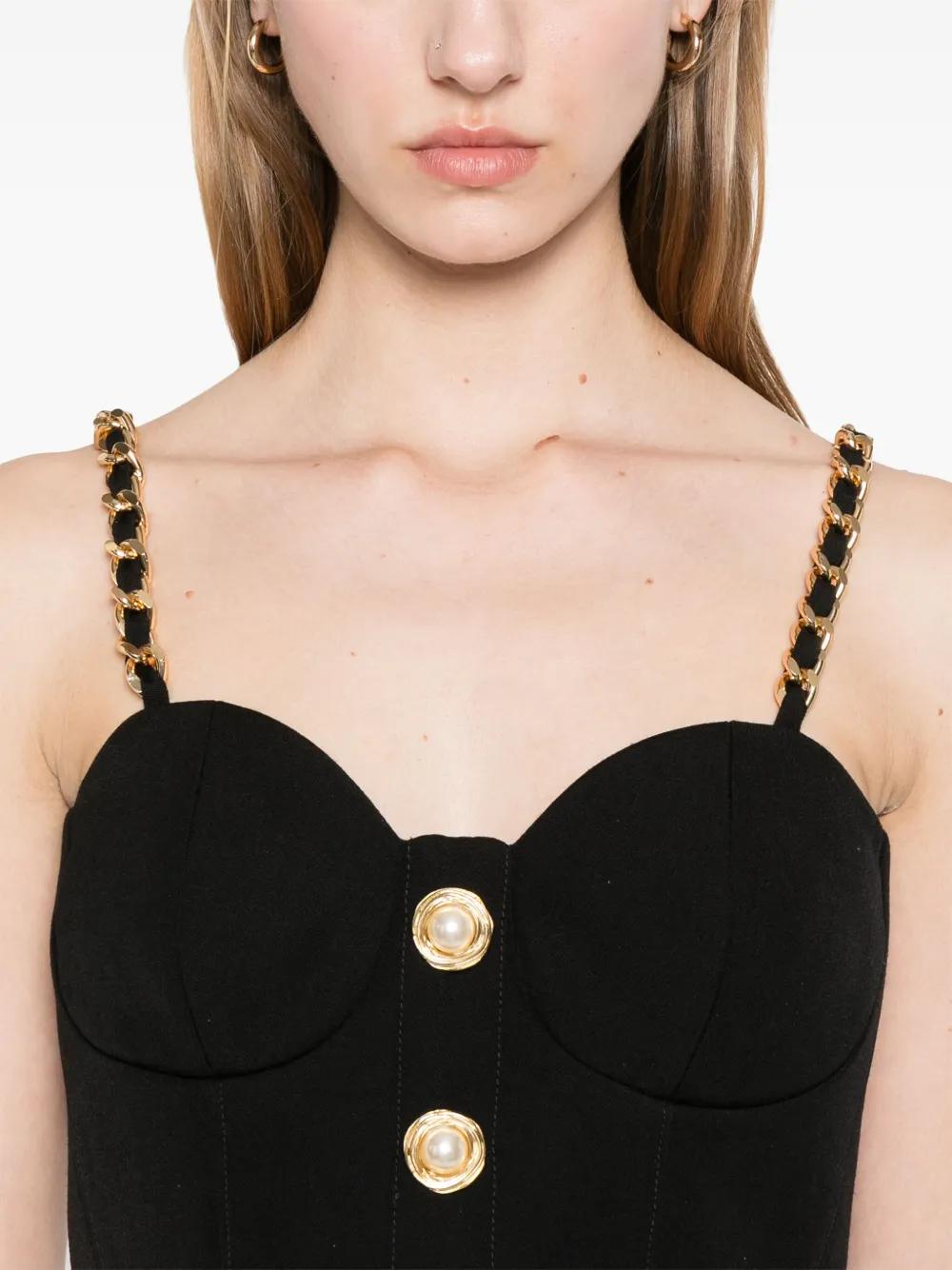 black exposed rear zip fastening sweetheart neck decorative button detailing straight hem