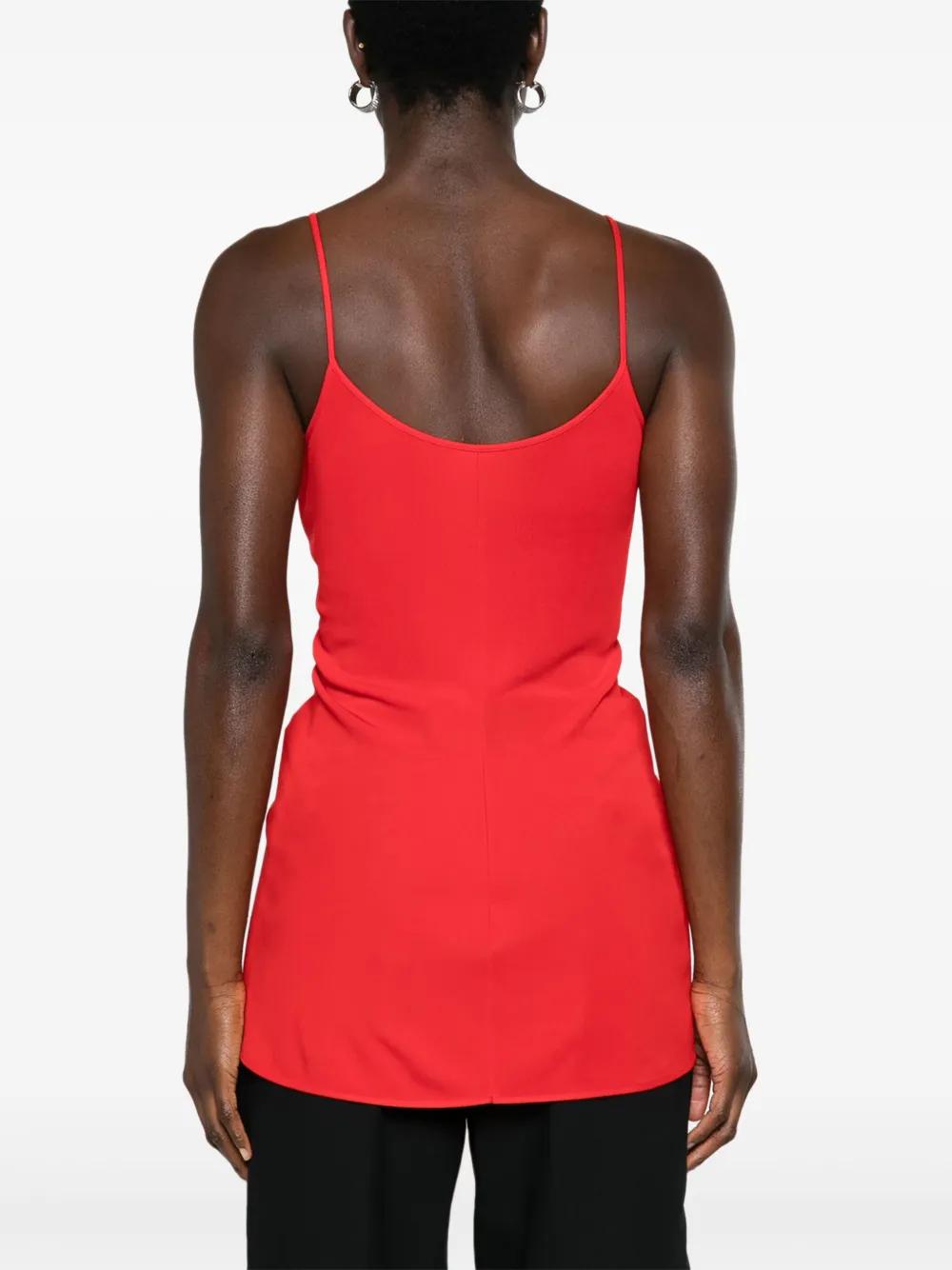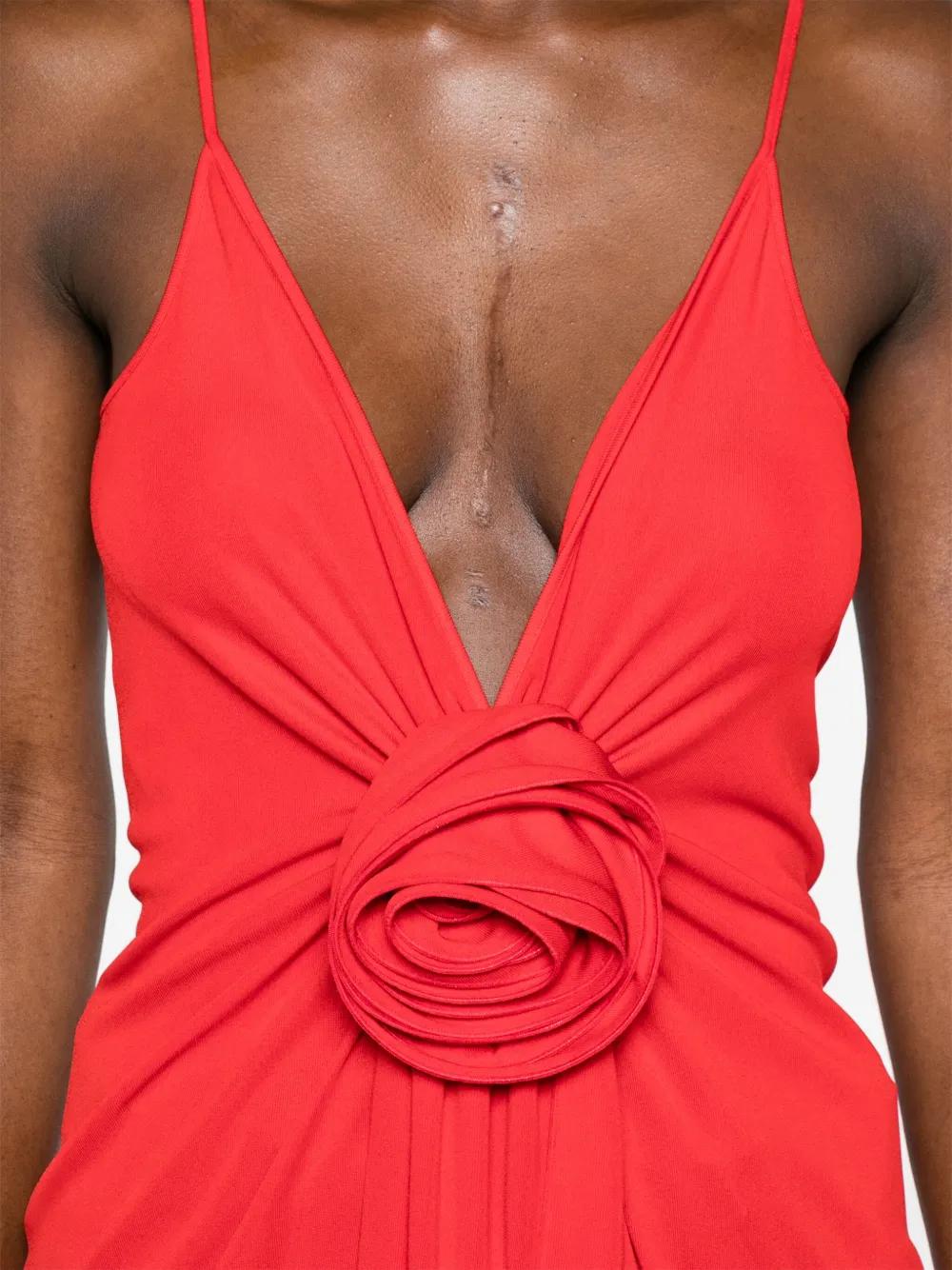 bright red finished edge floral appliqué draped detailing plunging V-neck spaghetti straps straight hem