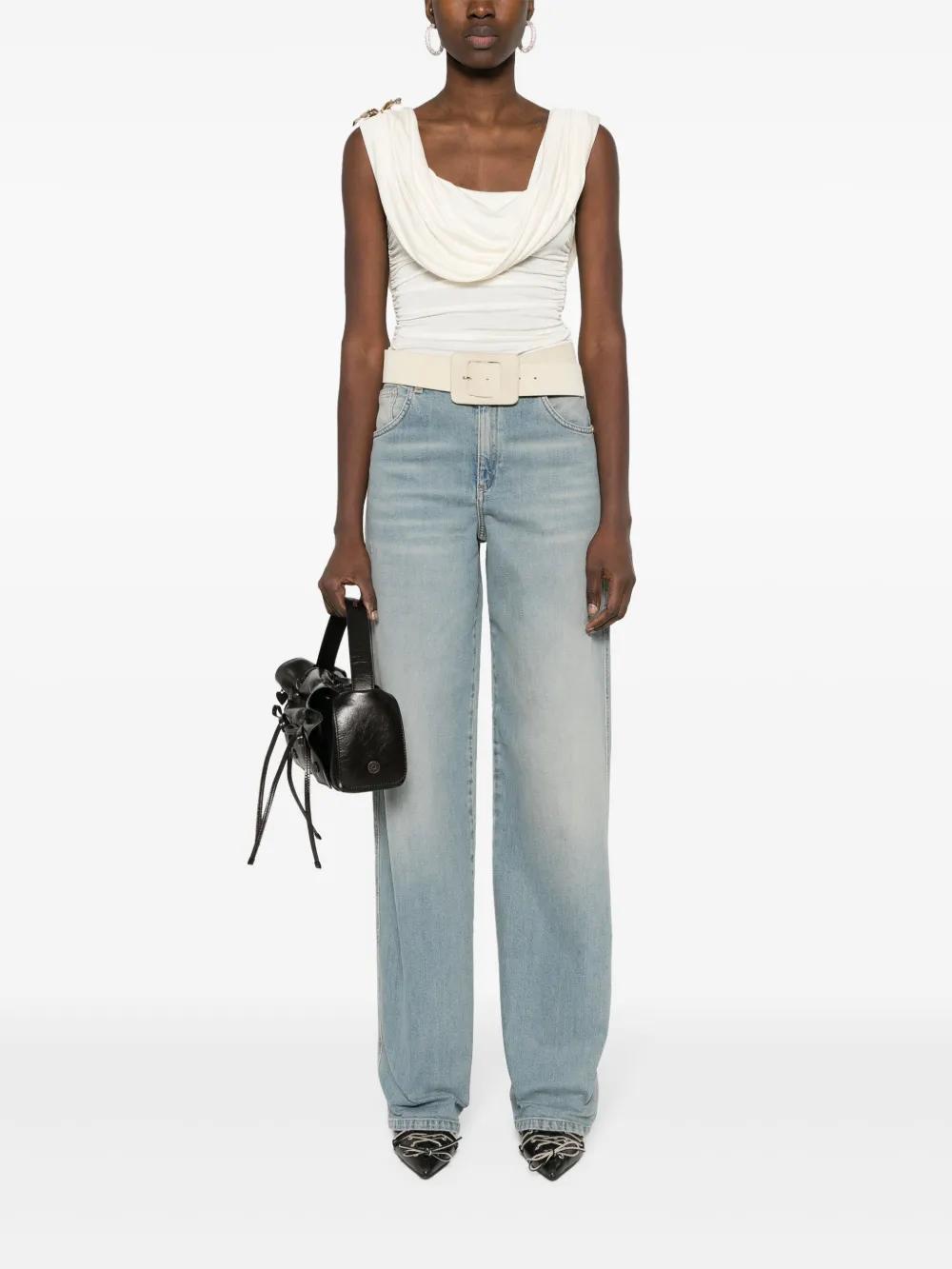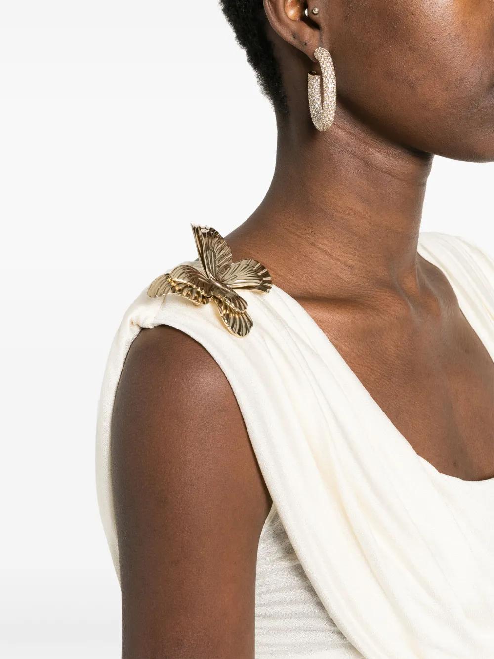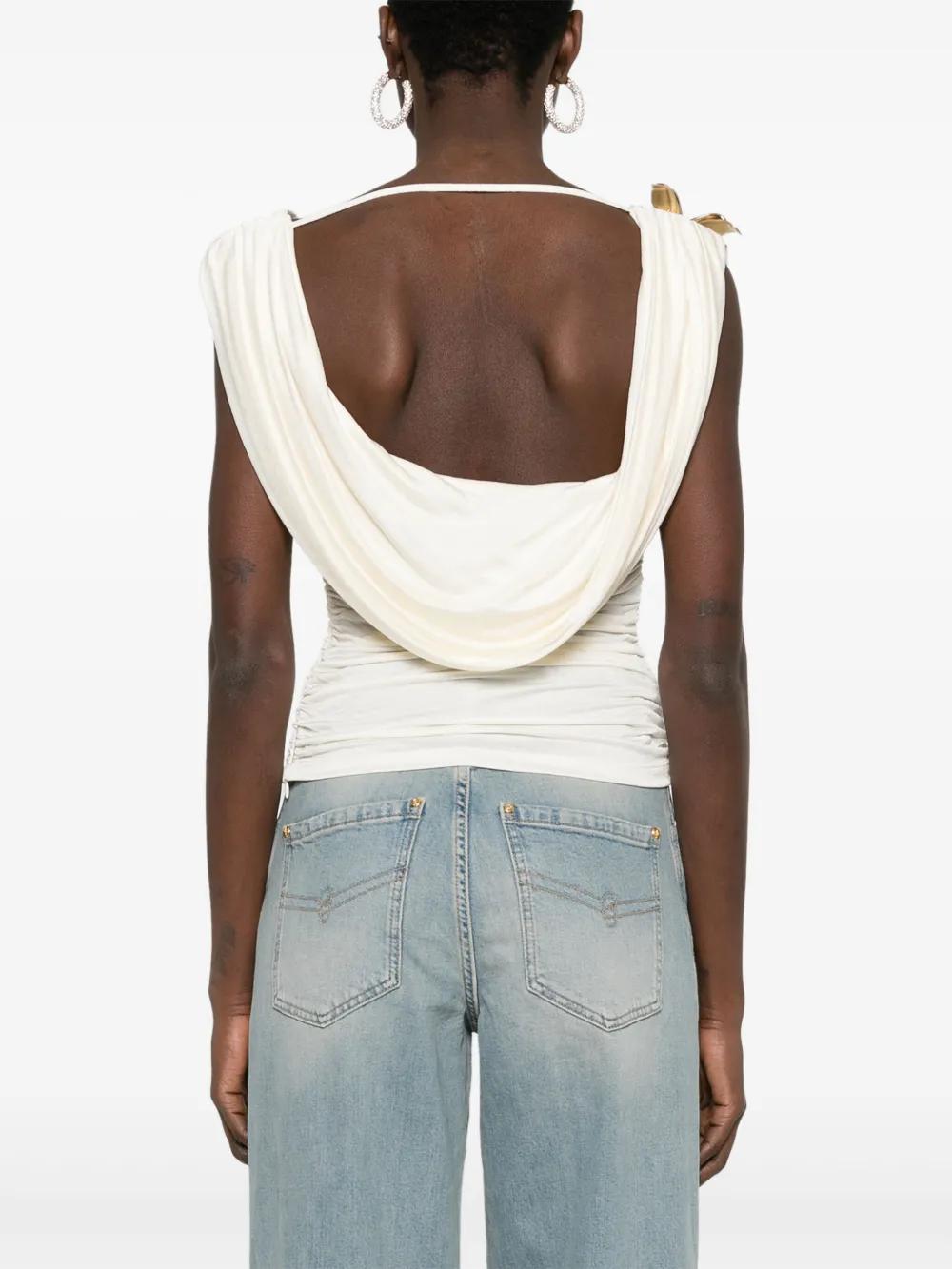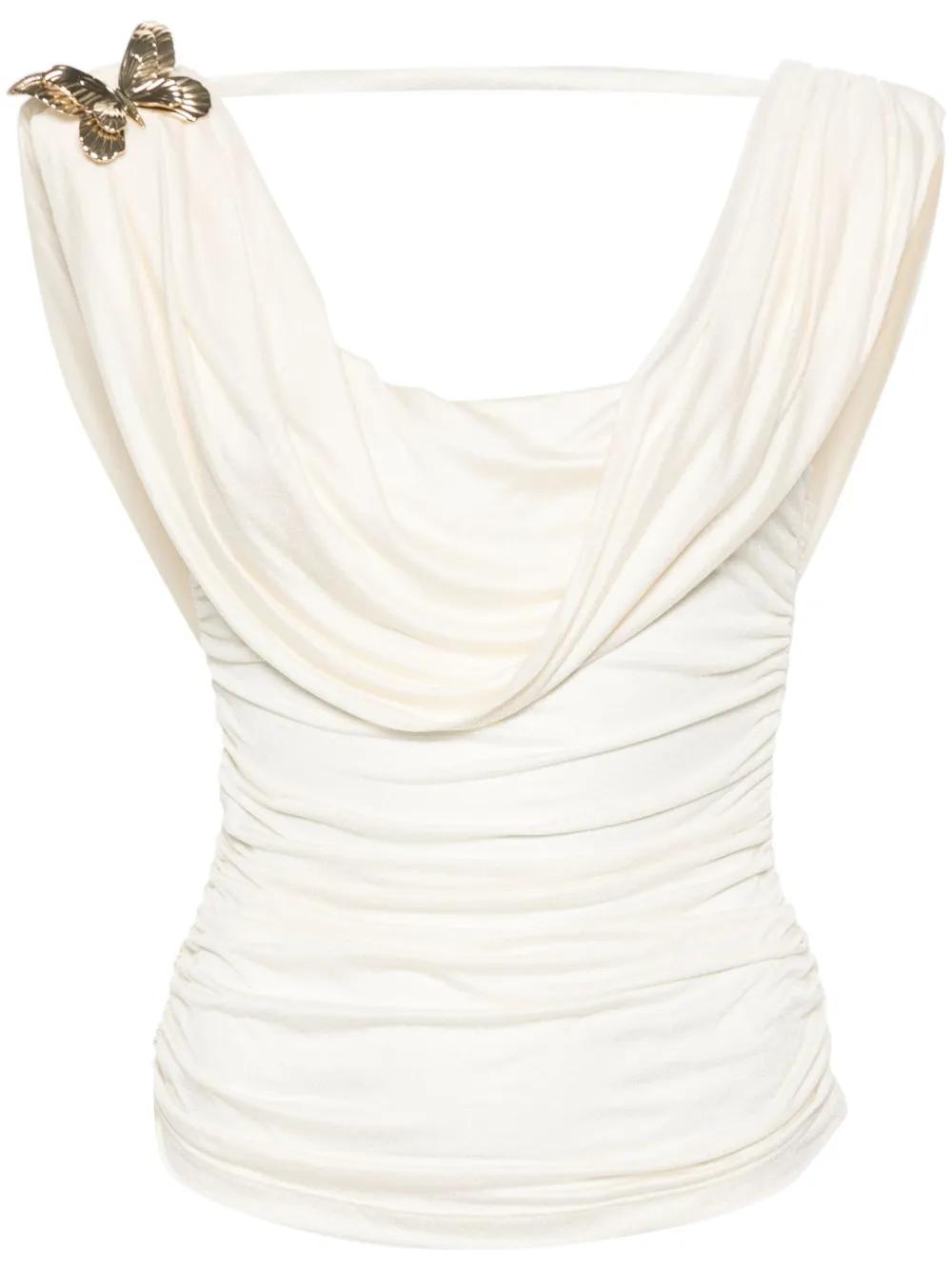 almond beige satin weave cowl neck sleeveless butterfly detail at the shoulder draped and gathered detailing curved hem