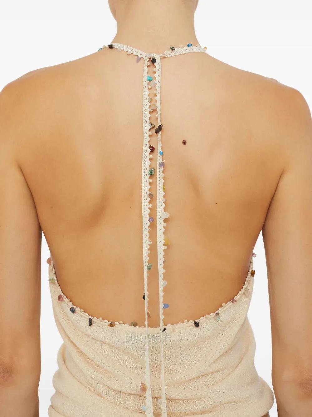 light beige cotton-blend halter neck beaded embellishment tie fastening sleeveless