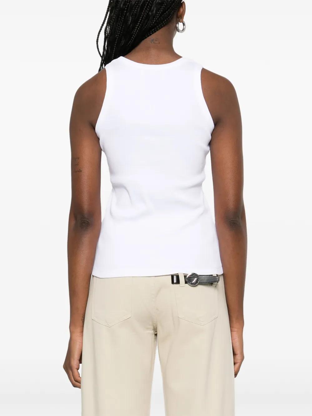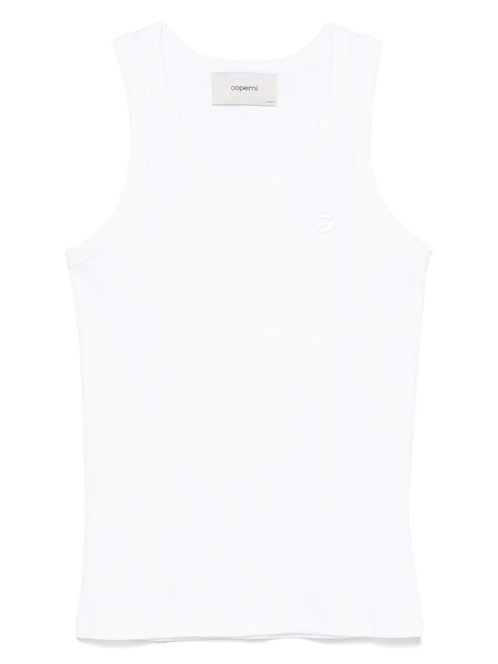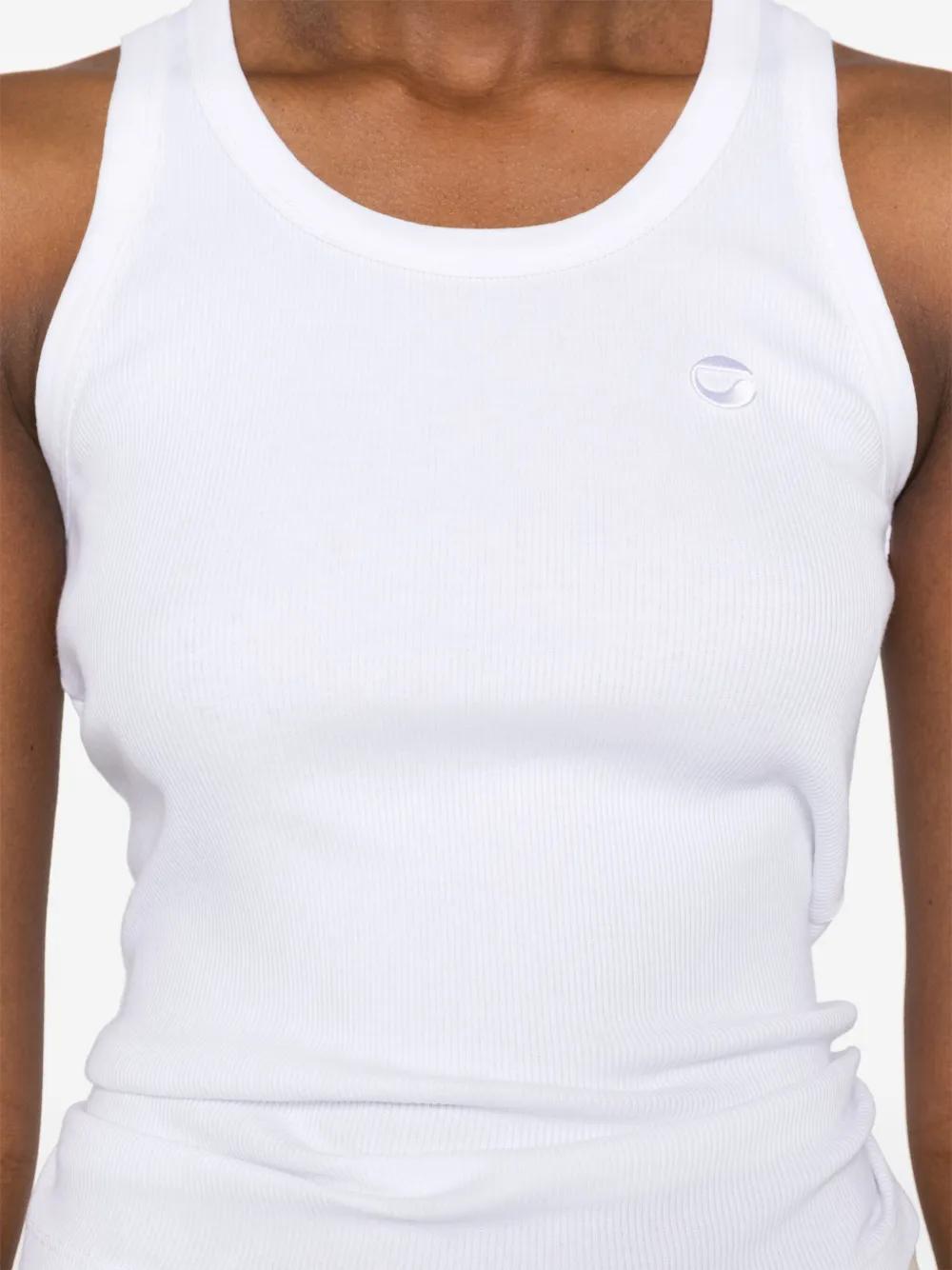 white cotton jersey texture ribbed trim open back U-neck logo patch to the front sleeveless straight hem