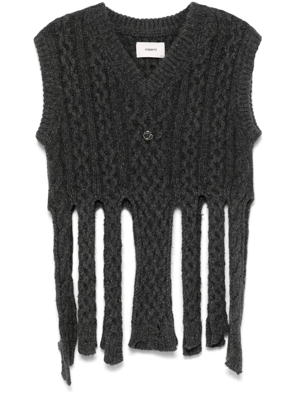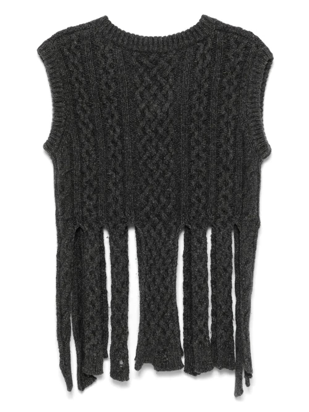 anthracite grey chunky cable knit distressed finish V-neck sleeveless ribbed cuffs logo plaque fringed edge