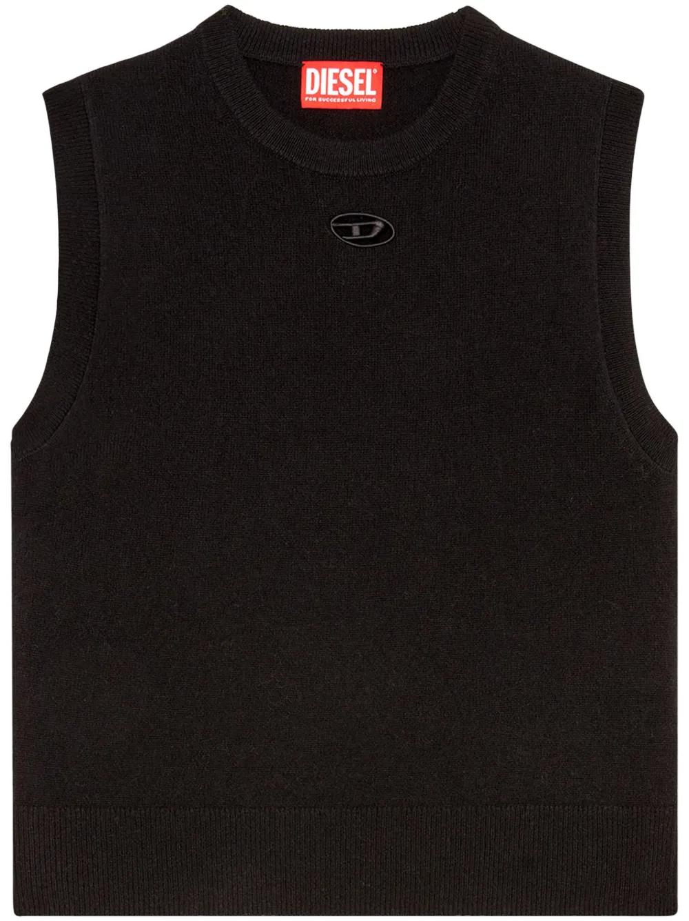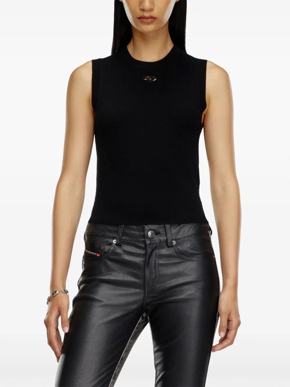 black wool blend knitted construction embroidered logo to the front ribbed band collar crew neck sleeveless ribbed cuffs and hem cropped straight hem
