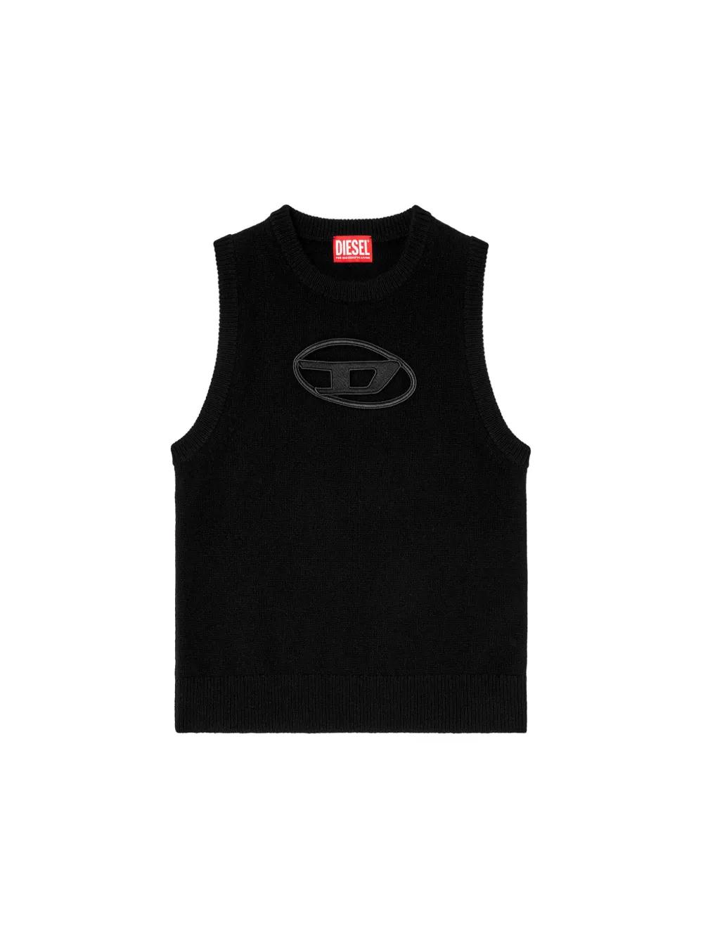 black wool tricot knit ribbed trim crew neck appliqué logo cut-out detailing sleeveless