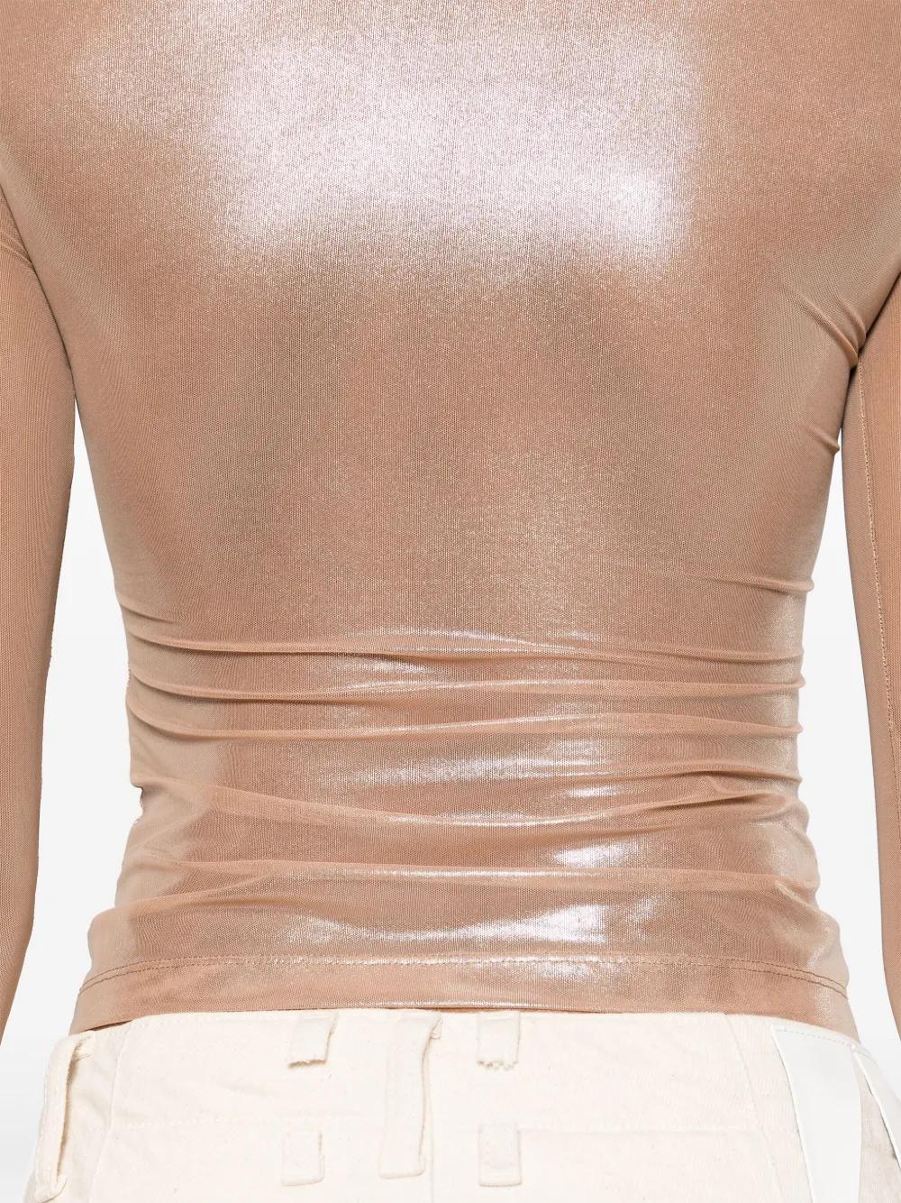 beige semi-sheer construction metallic finish round neck long sleeves straight hem