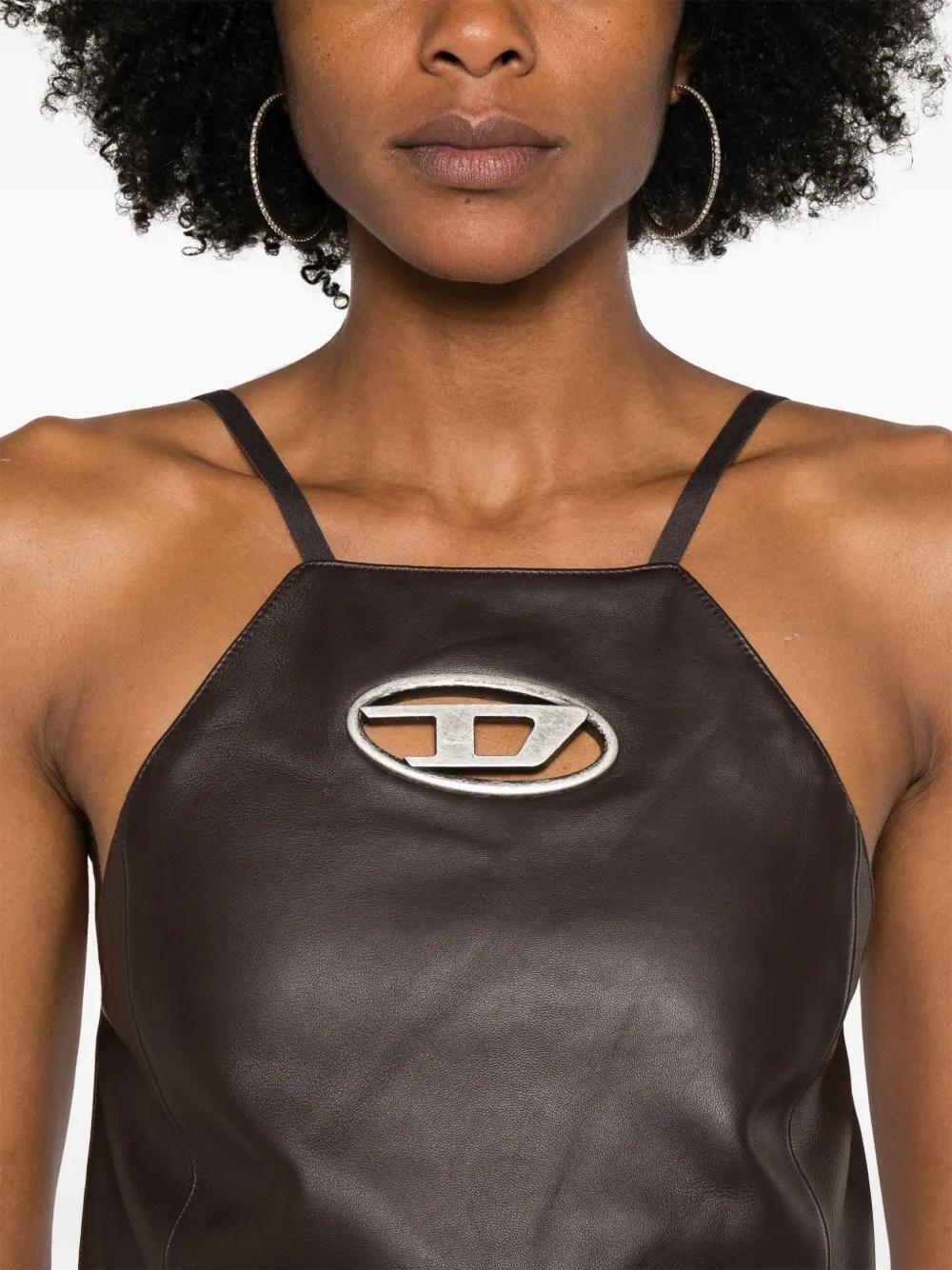 cedar brown calf leather pebbled texture hook-clip fastening square neck thin shoulder straps cut-out detailing silver-tone logo plaque open back full lining straight hem
