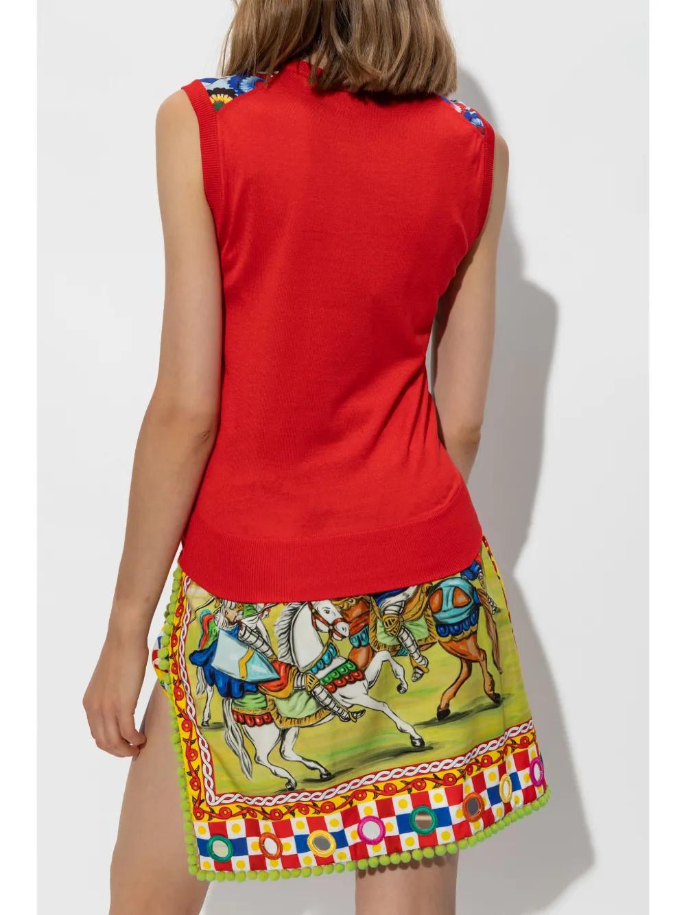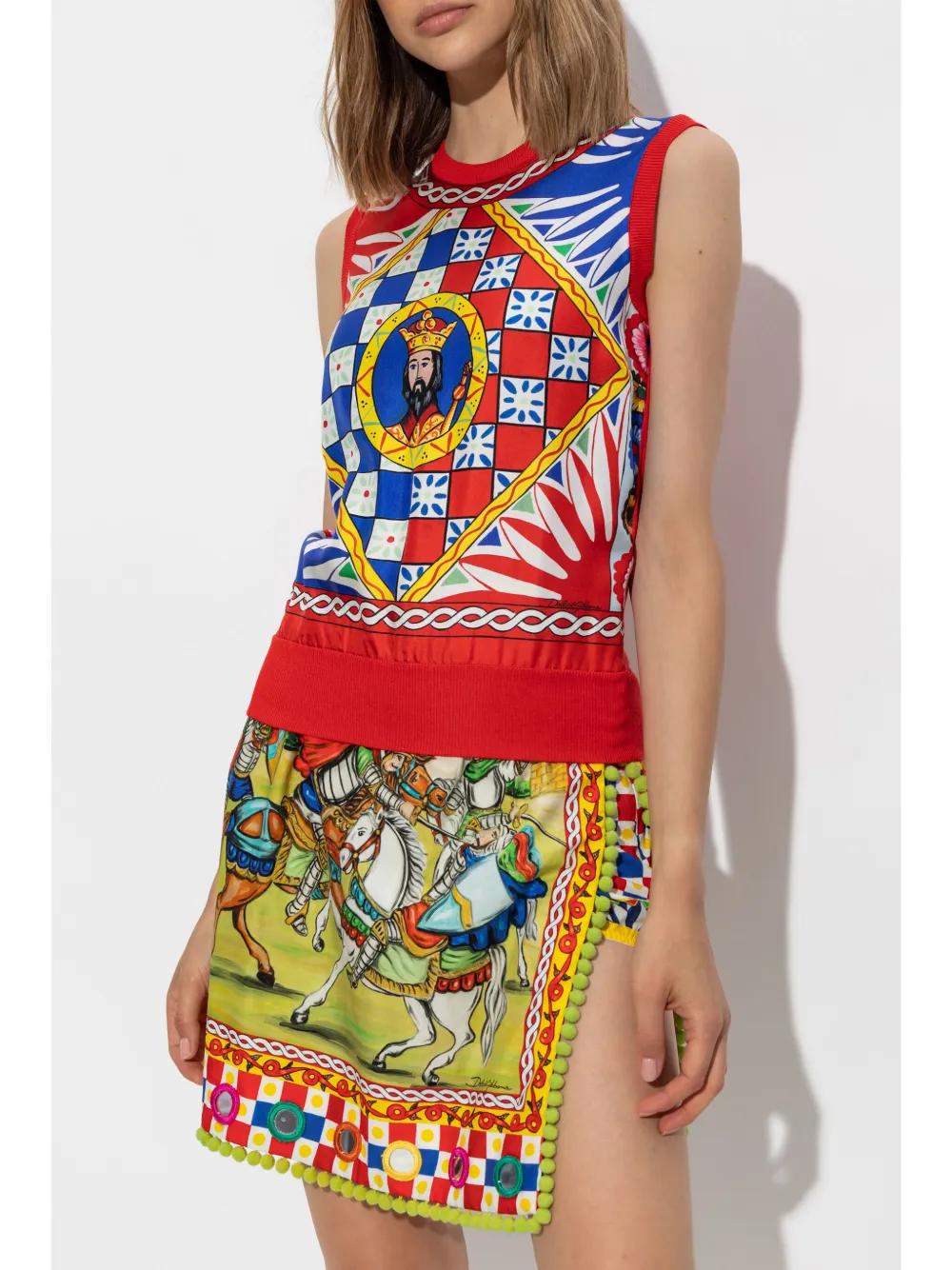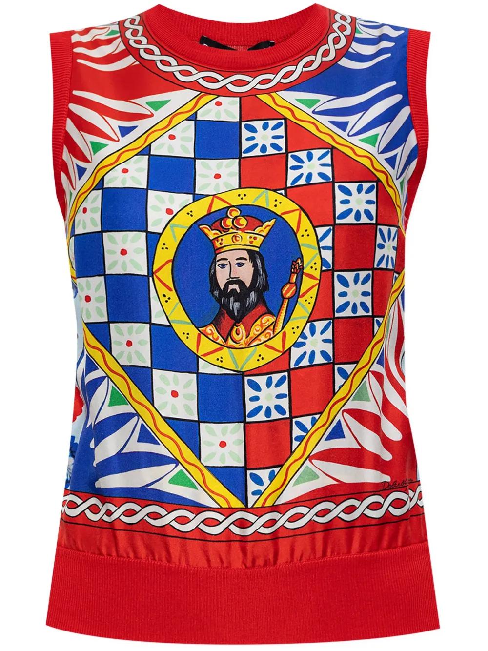 red/multicolour silk ribbed detailing crew neck sleeveless all-over graphic print straight hem