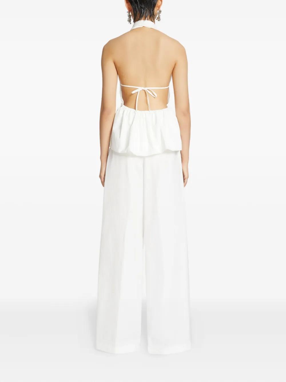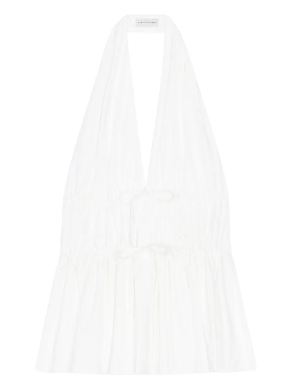 white halter neckline gathered bodice ruffle detailing peplum hem adjustable straps