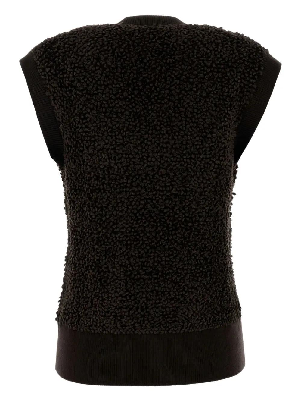 dark brown boucle design V-neck sleeveless ribbed hem short sleeves