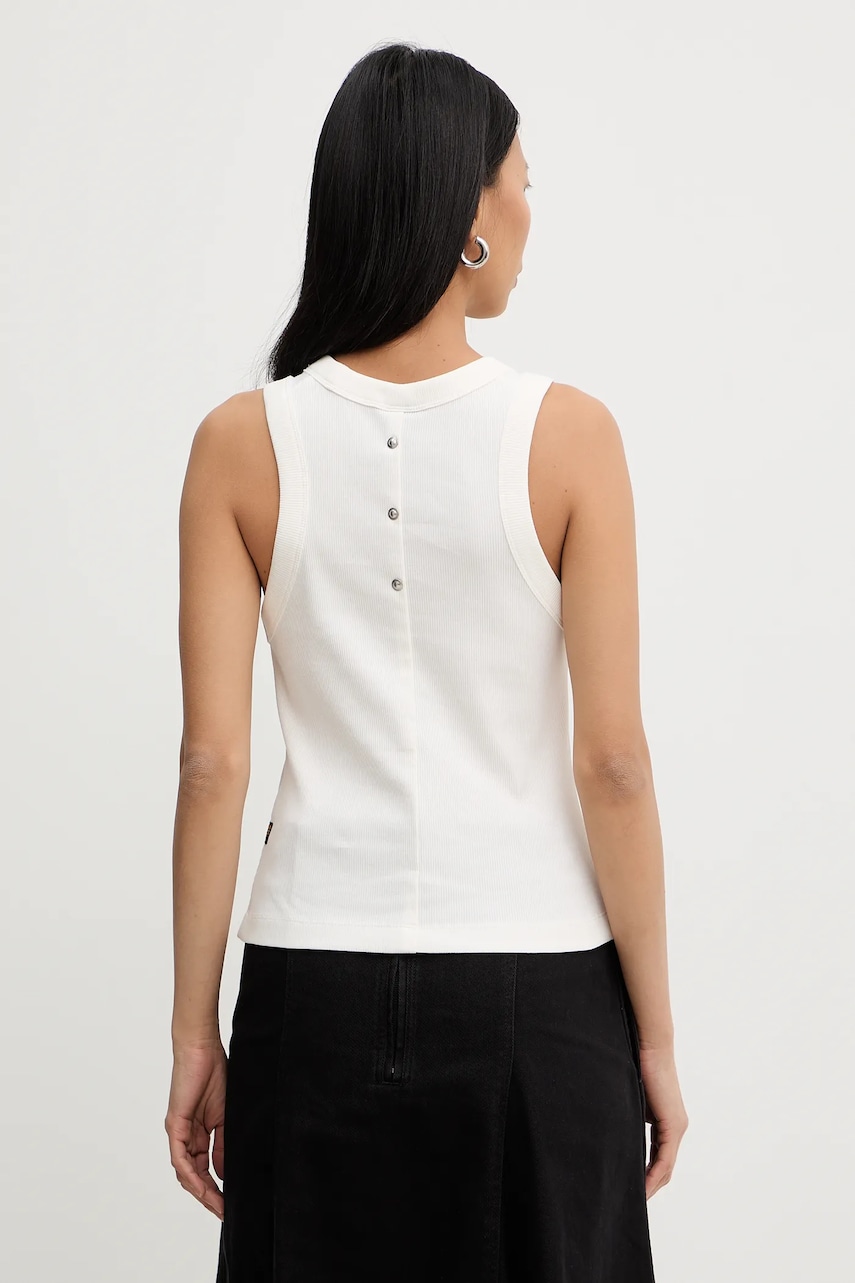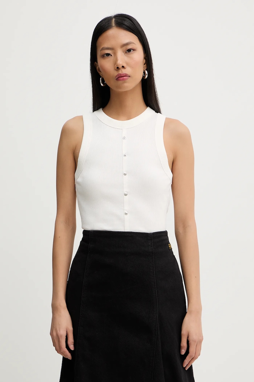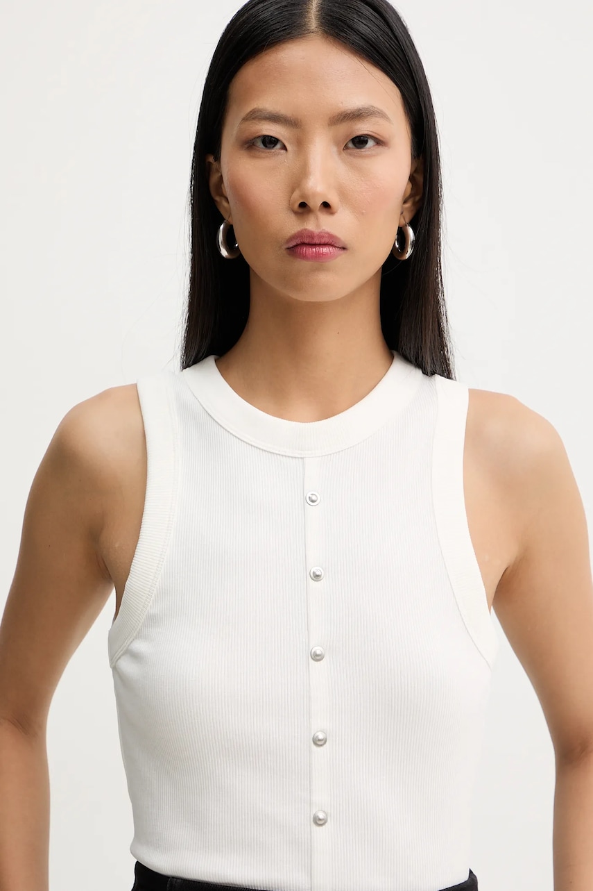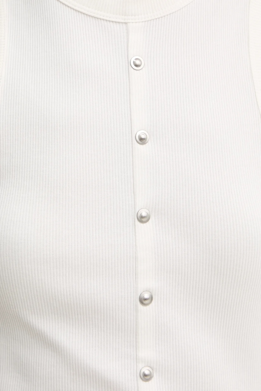 - Ten produkt został częściowo wykonany z bawełny organicznej. - Dopasowany, podkreślający sylwetkę fason. - Klasyczny, okrągły dekolt. - Model wykonany z dzianiny prążkowanej. - Długość: 52 cm. - Szerokość pod pachami: 33 cm. - Wymiary podane dla rozmiaru: S.