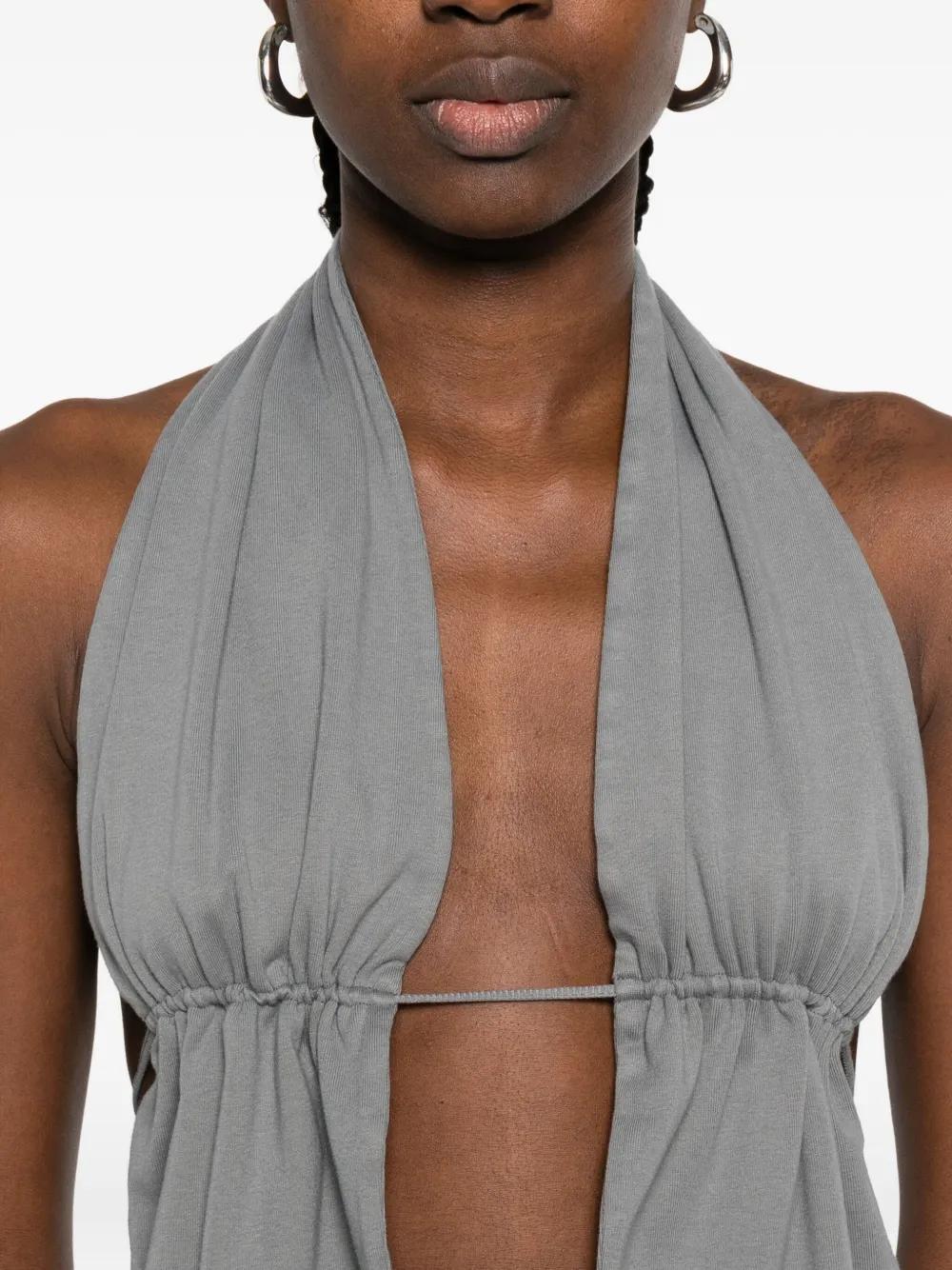 black tie fastening straps lobster clasp detail halterneck gathered detail sleeveless