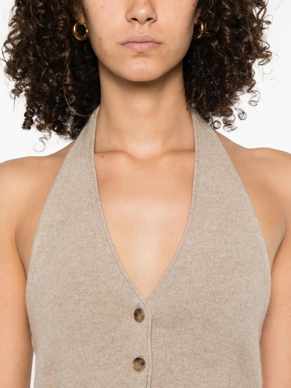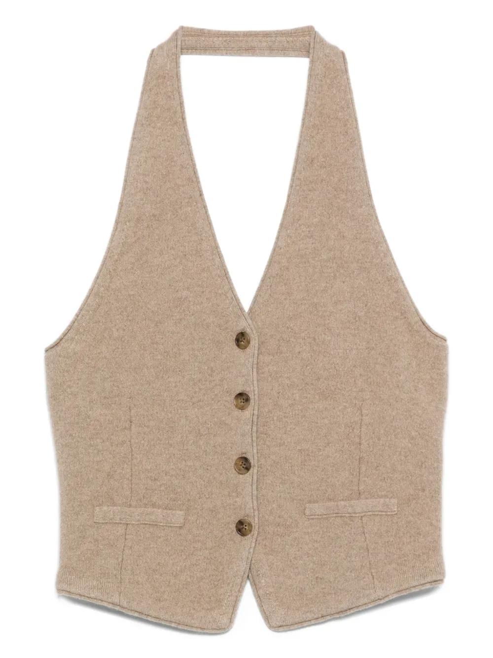 beige halterneck front button fastening cashmere welt pockets sleeveless