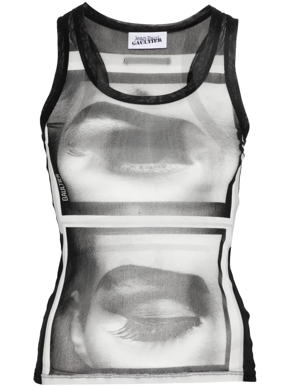 black/white mesh design semi-sheer construction face print round neck sleeveless straight hem