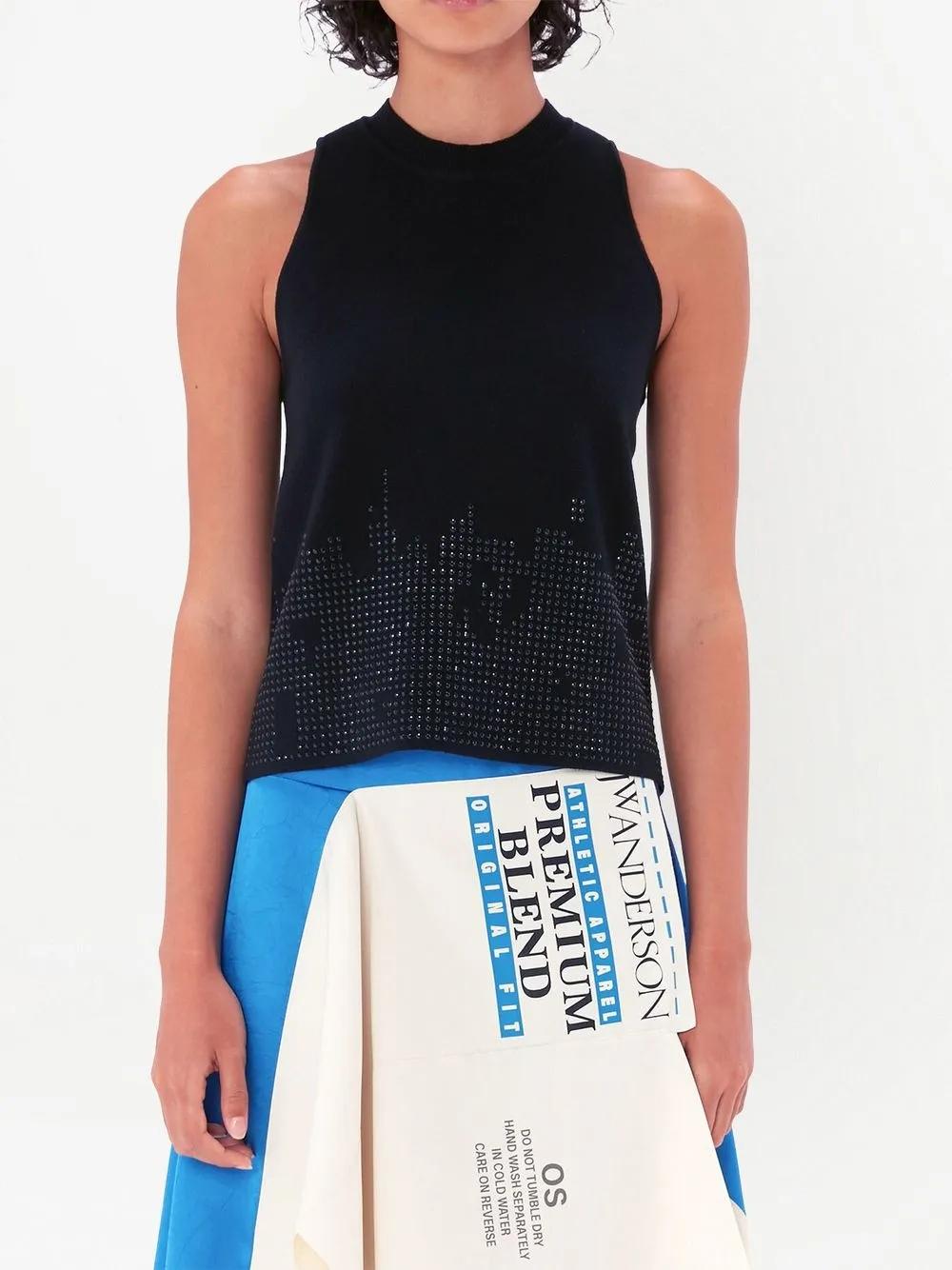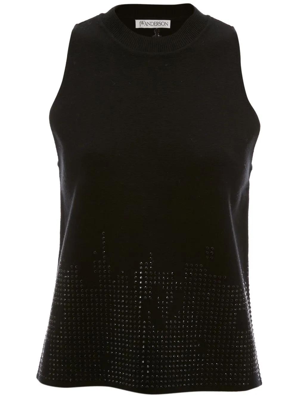 black merino wool fine knit stud detail at the hem crew neck sleeveless straight hem