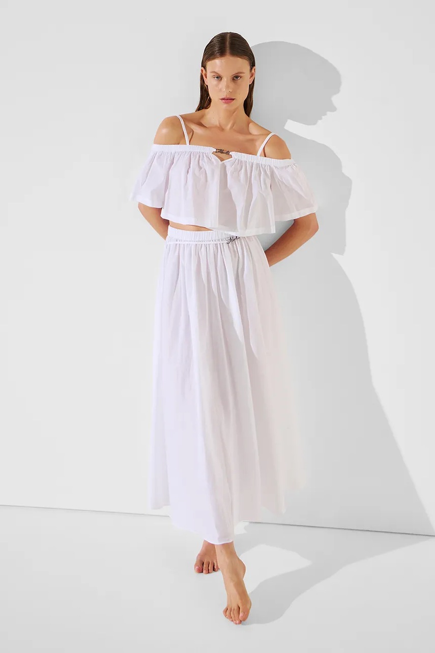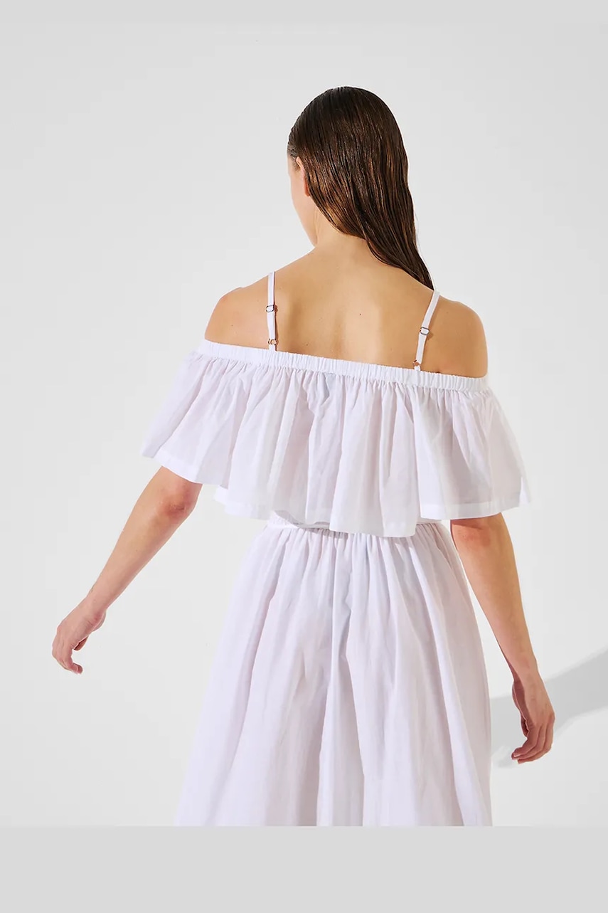 - Luźny krój zapewniający pełną swobodę ruchów. - Regulowane ramiączka. - Model z ozdobną falbaną. - Dekolt typu hiszpanka. - Cienki materiał.