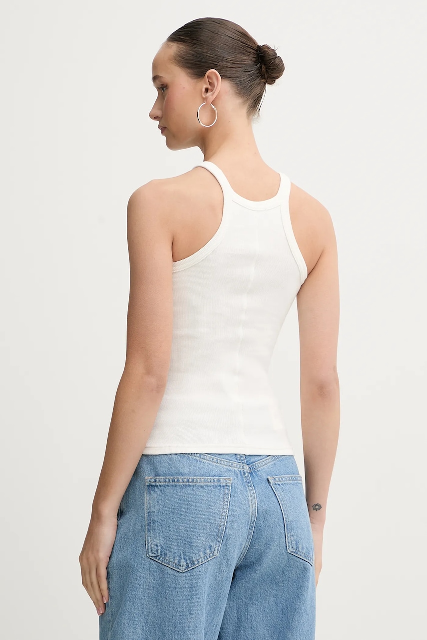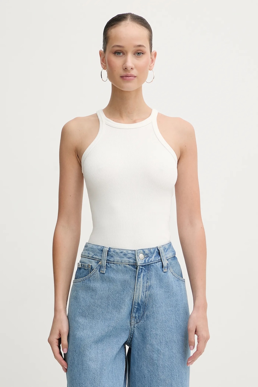 - Model wykonany z dzianiny o strukturze prążków, która jest niezwykle elastyczna i miękka, przez co dobrze dopasowuje się do sylwetki i jest wygodna w użytkowaniu. - Klasyczny, okrągły dekolt. - Model na ramiączkach. - Długość: 51 cm. - Szerokość pod pachami: 31 cm. - Wymiary podane dla rozmiaru: 36.