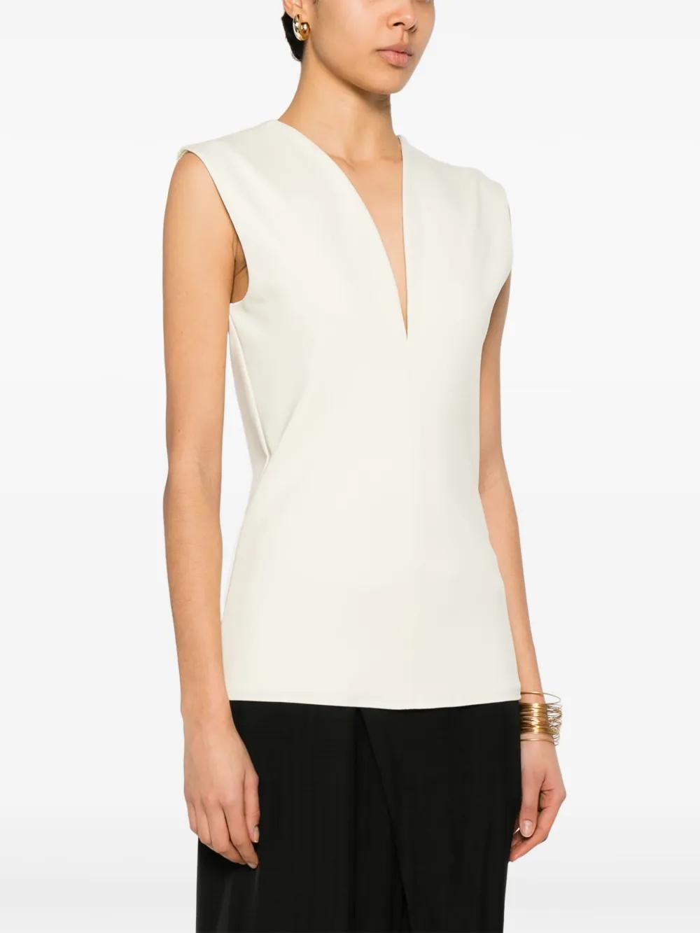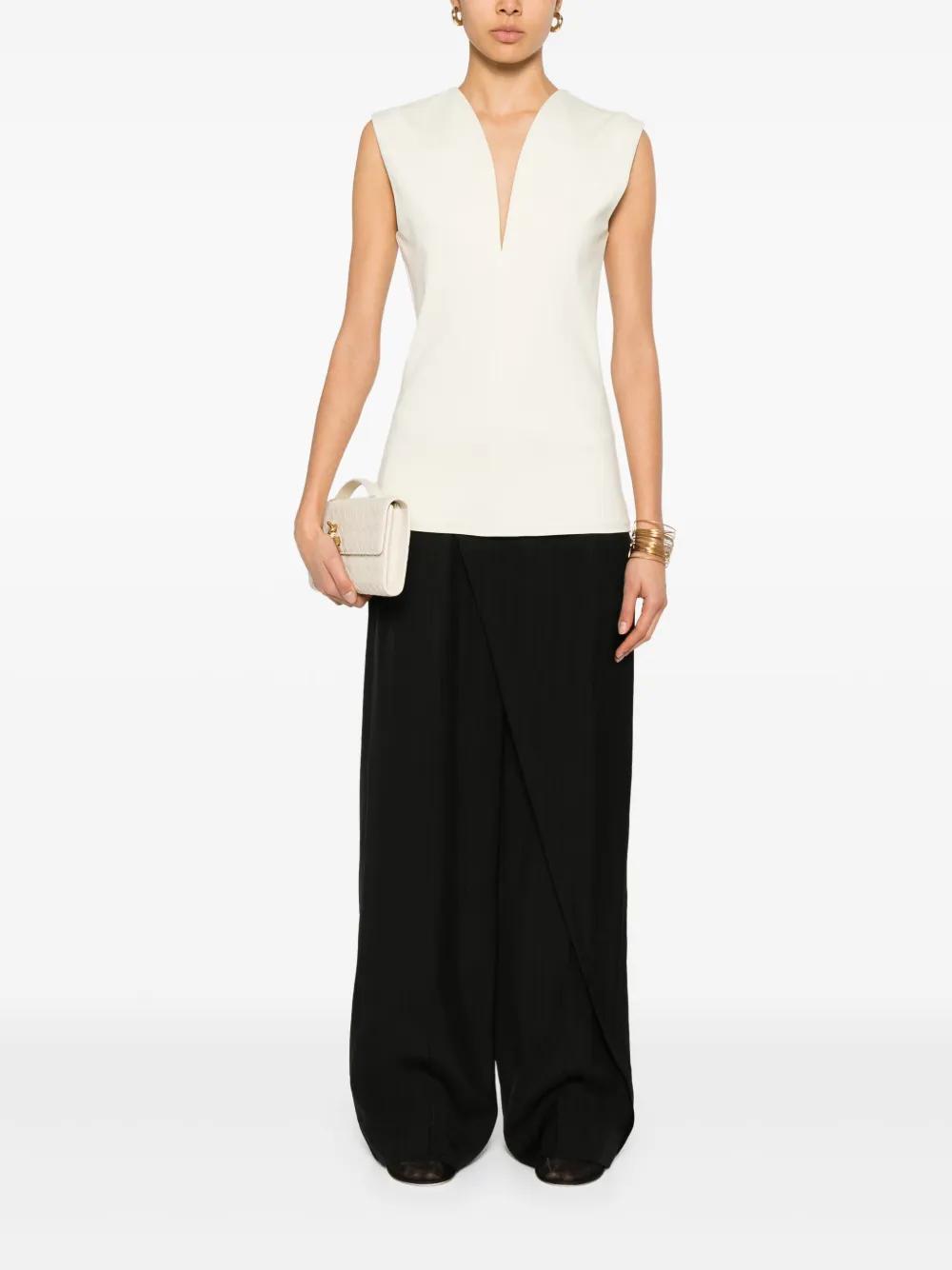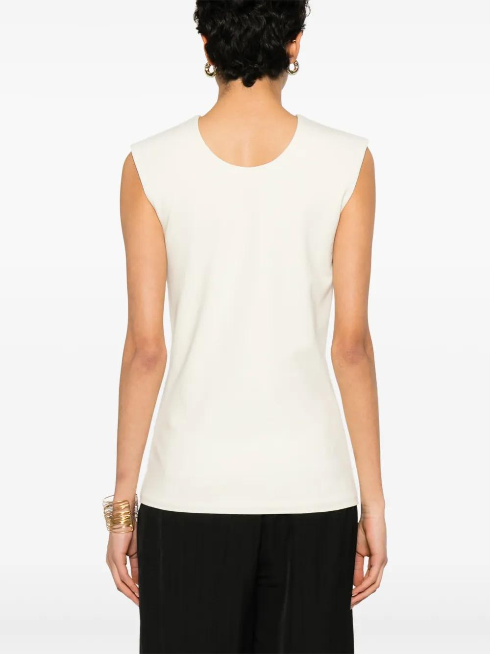 white crepe de chine plissé effect round neck with raw-cut edge sleeveless ruffle hem silver-tone buttons short front button fastening