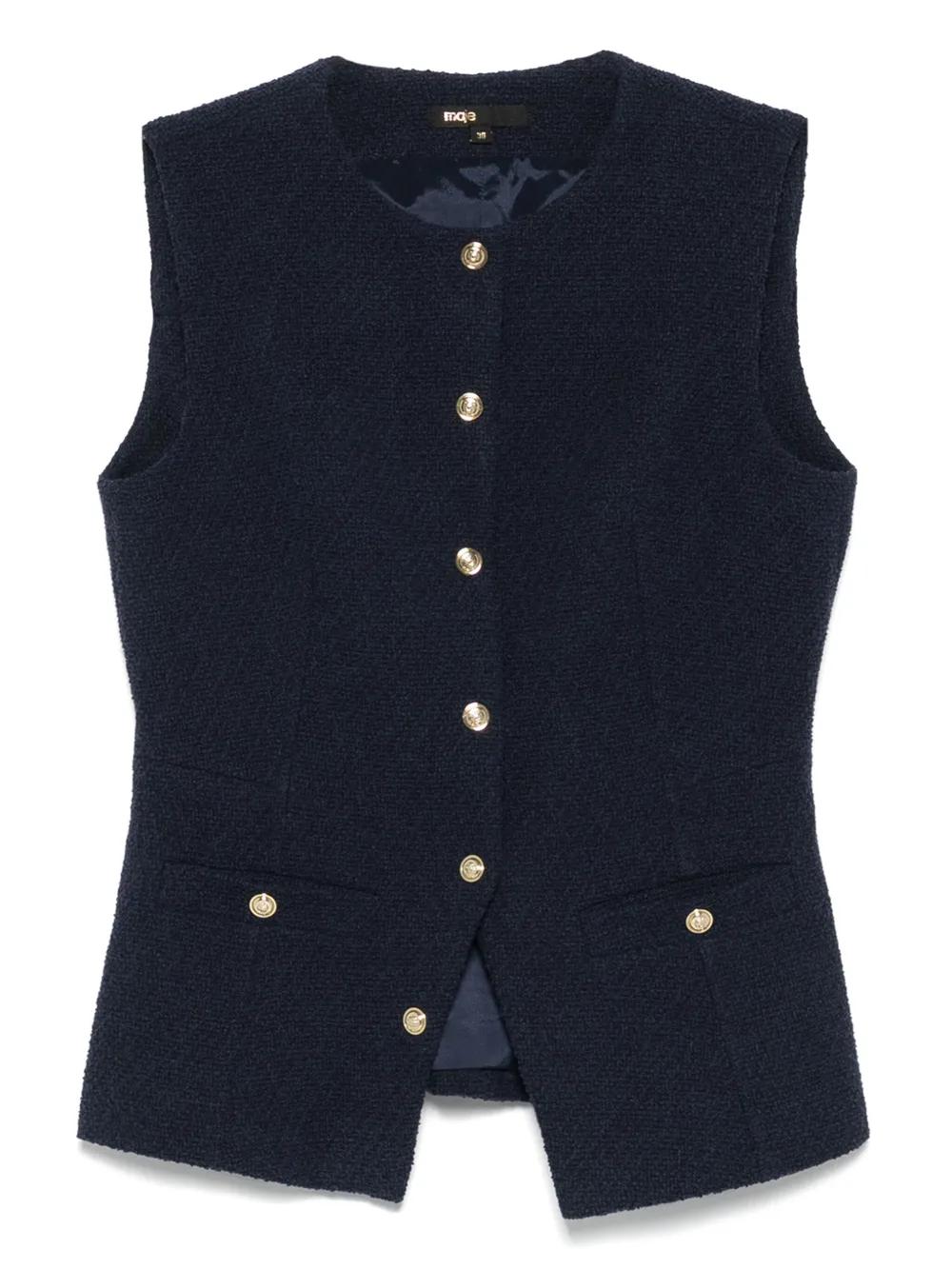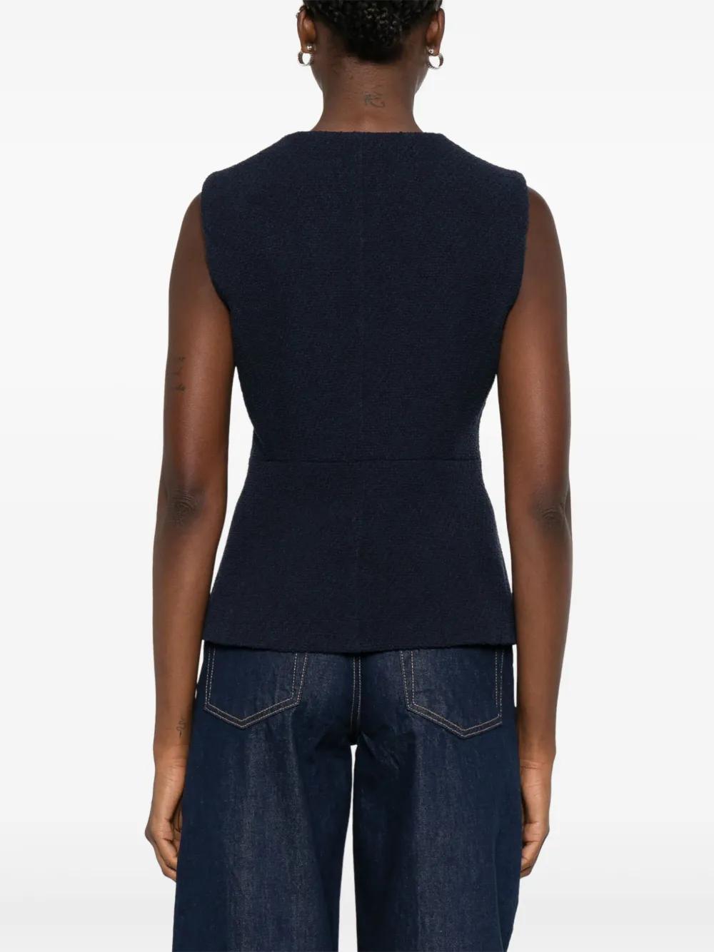 navy blue front button fastening faux pocket detail round neck sleeveless