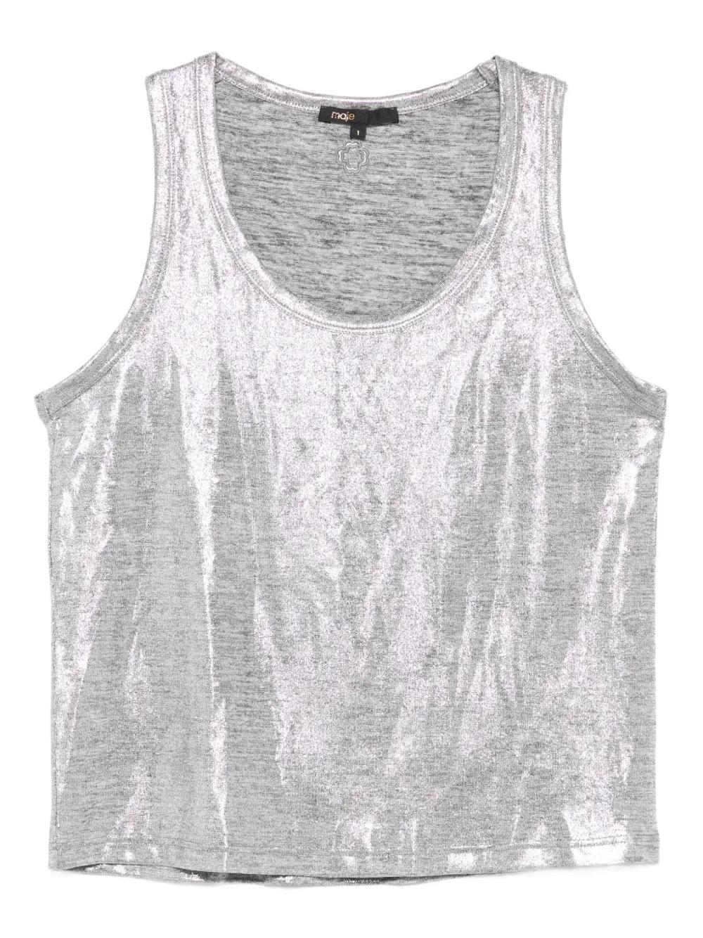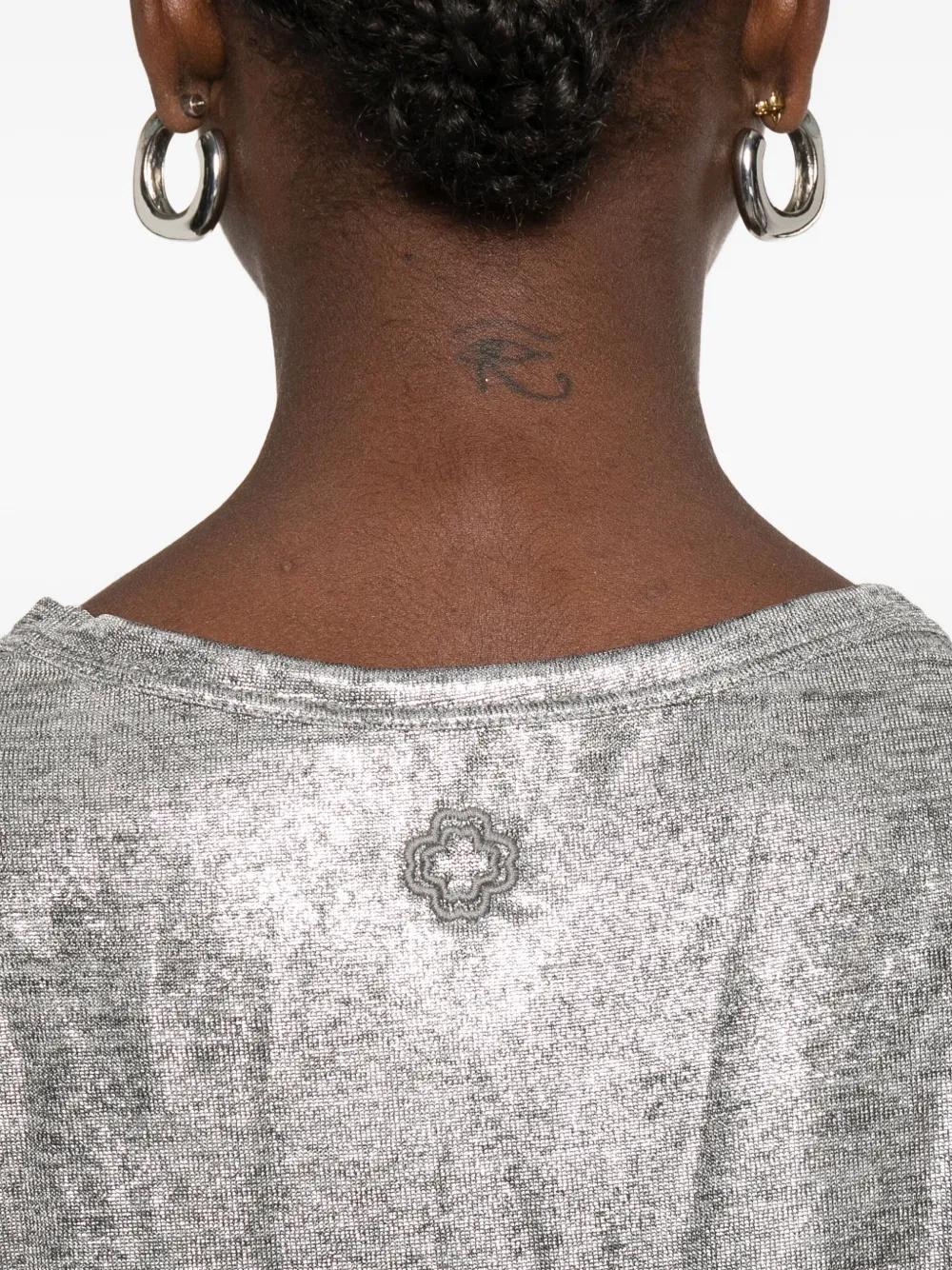 black faux leather silver-tone logo plaque scoop neck crossover shoulder straps cropped