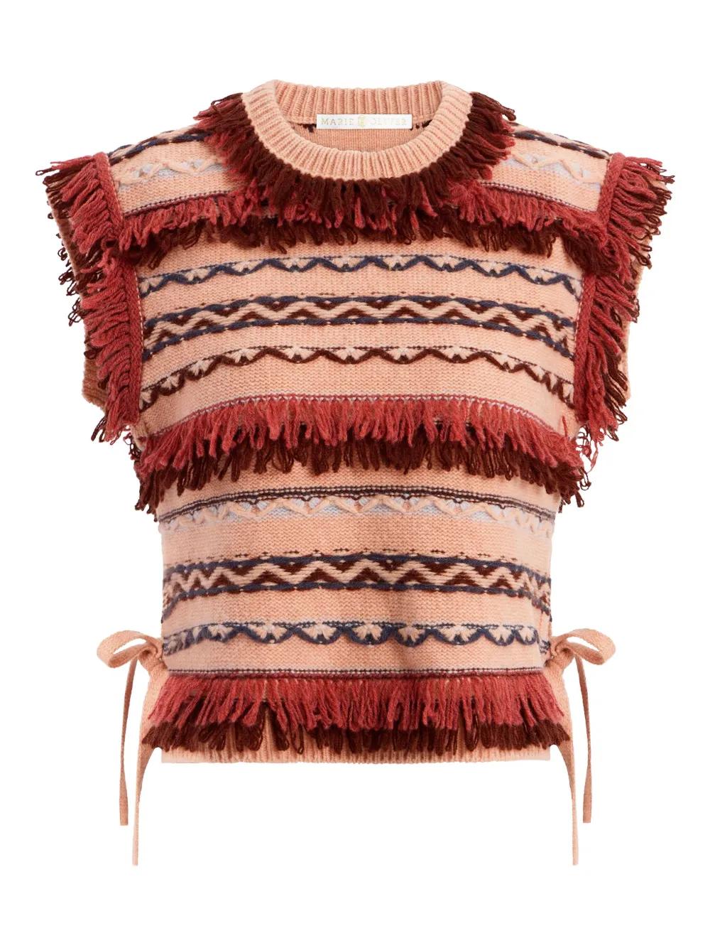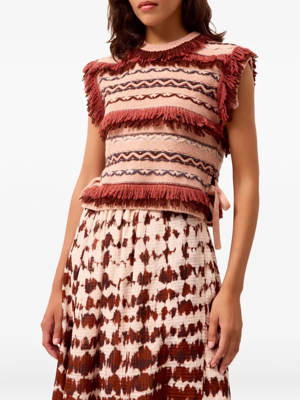 dusty rose wool knit striped pattern fringed trim sleeveless side ties