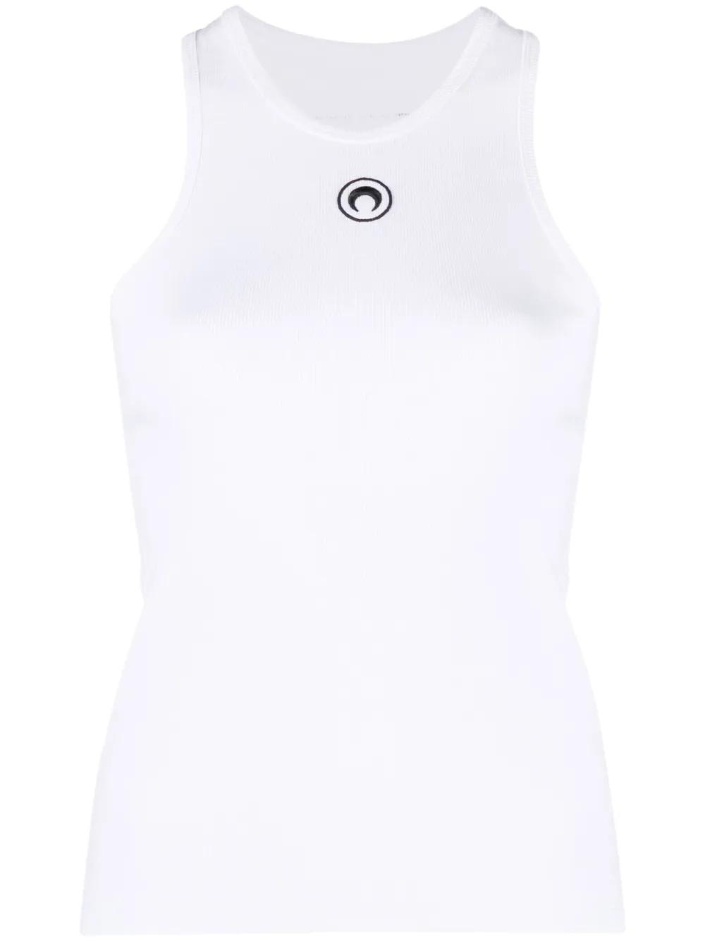 white/black organic cotton blend crescent moon print logo print to the front logo patch to the rear round neck sleeveless racerback