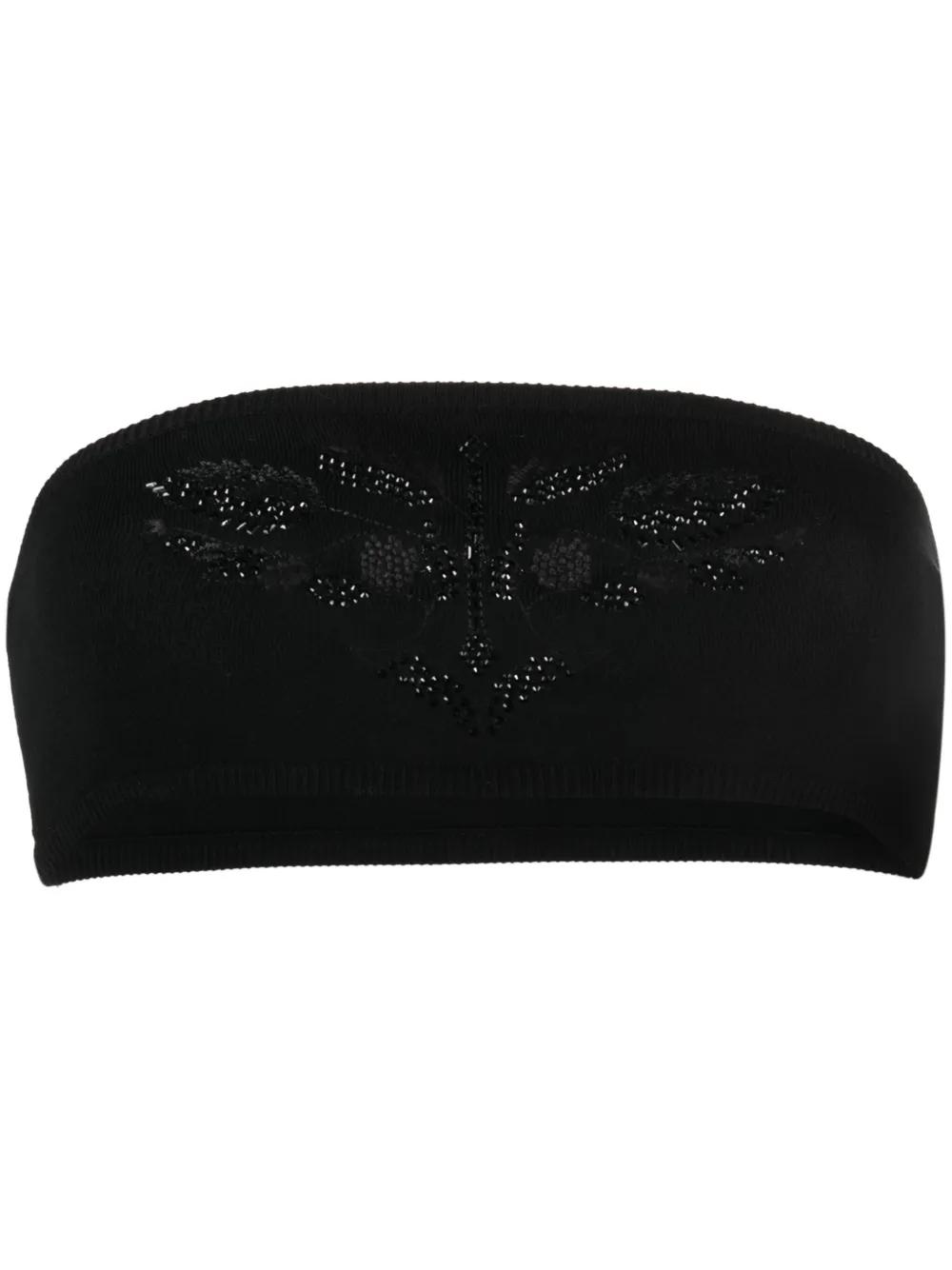 jet black ribbed knit ribbed-knit edge stud embellishment floral embroidery to the front sleeveless straight hem cropped