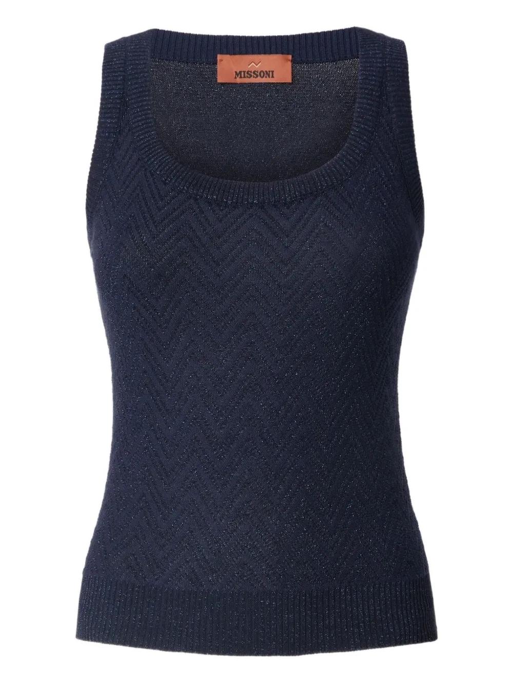 navy blue chevron pattern sleeveless round neck metallic thread The item you receive may differ slightly from the item photographed. This is due to the artisanal nature with which all Missoni products are constructed.
