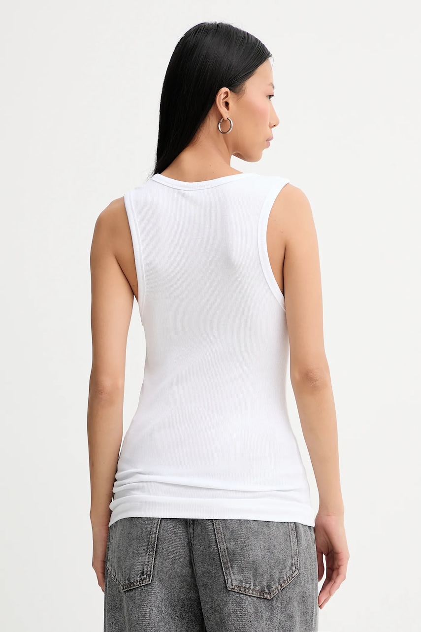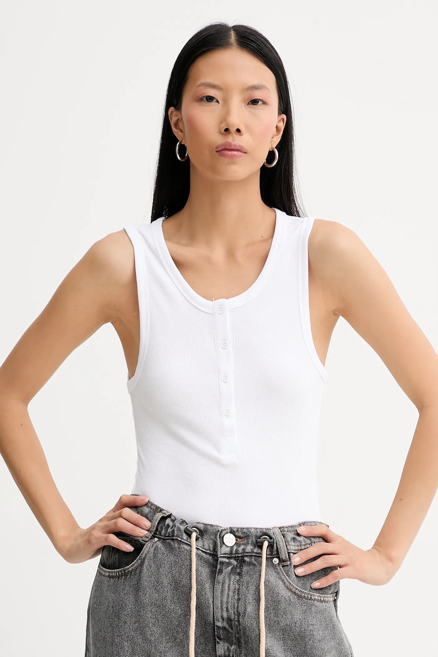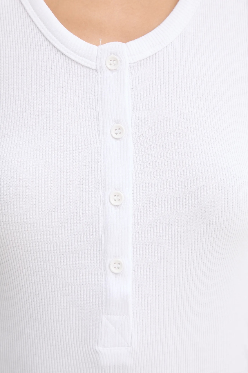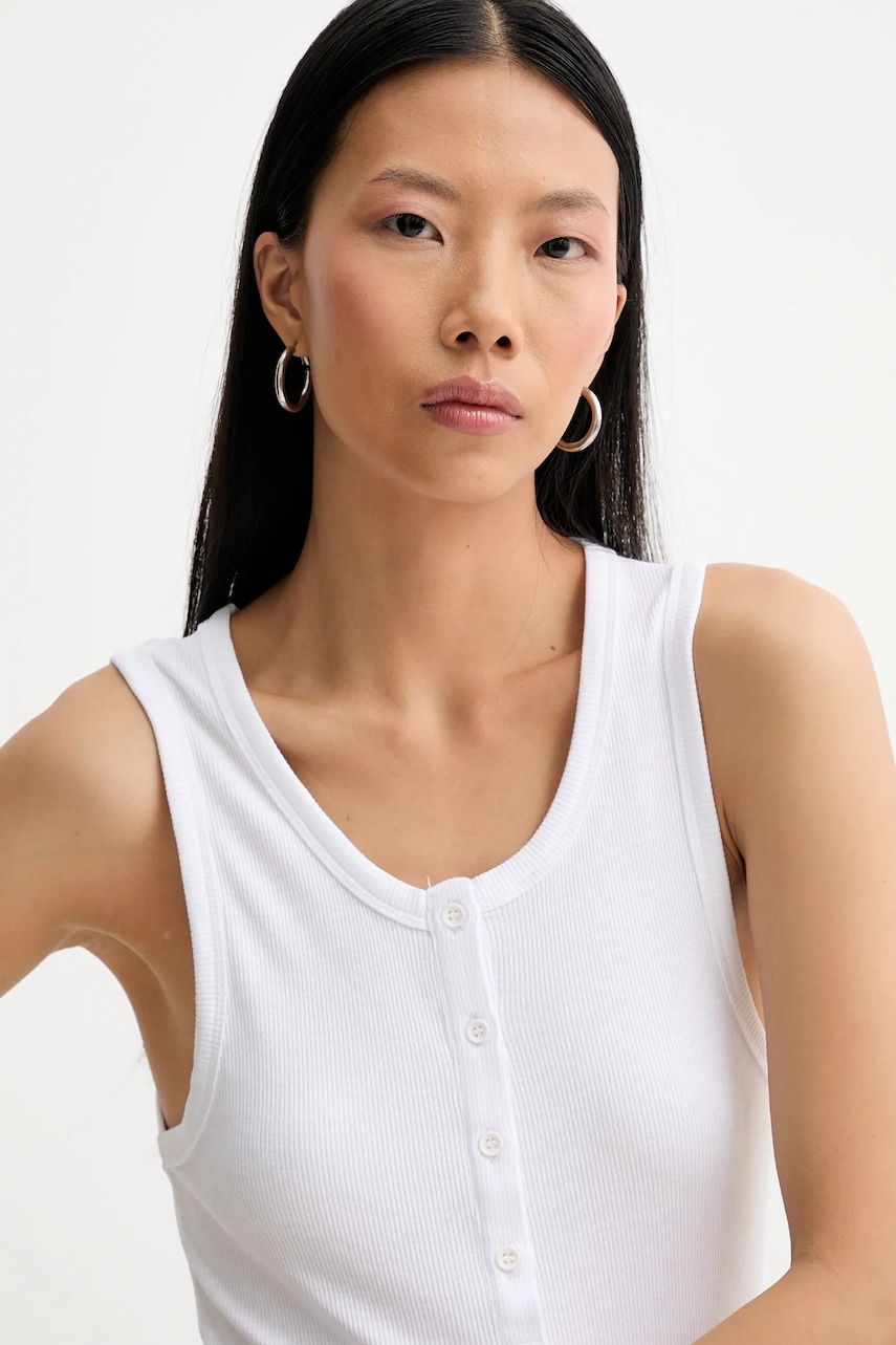 - Produkt częściowo wykonany z LENZING™ ECOVERO™ - materiału przyjaznego środowisku. Produkcja LENZING™ ECOVERO™ z ekologicznej celulozy i pulpy drzewnej wykorzystuje o 50% mniej wody w porównaniu do popularnej wiskozy. - Fason slim. - Okrągły dekolt. - Krótkie zapięcie na guziki. - Model bez rękawów. - Prążkowana dzianina. - Długość: 62 cm. - Szerokość pod pachami: 37 cm. - Wymiary podane dla rozmiaru: 36.