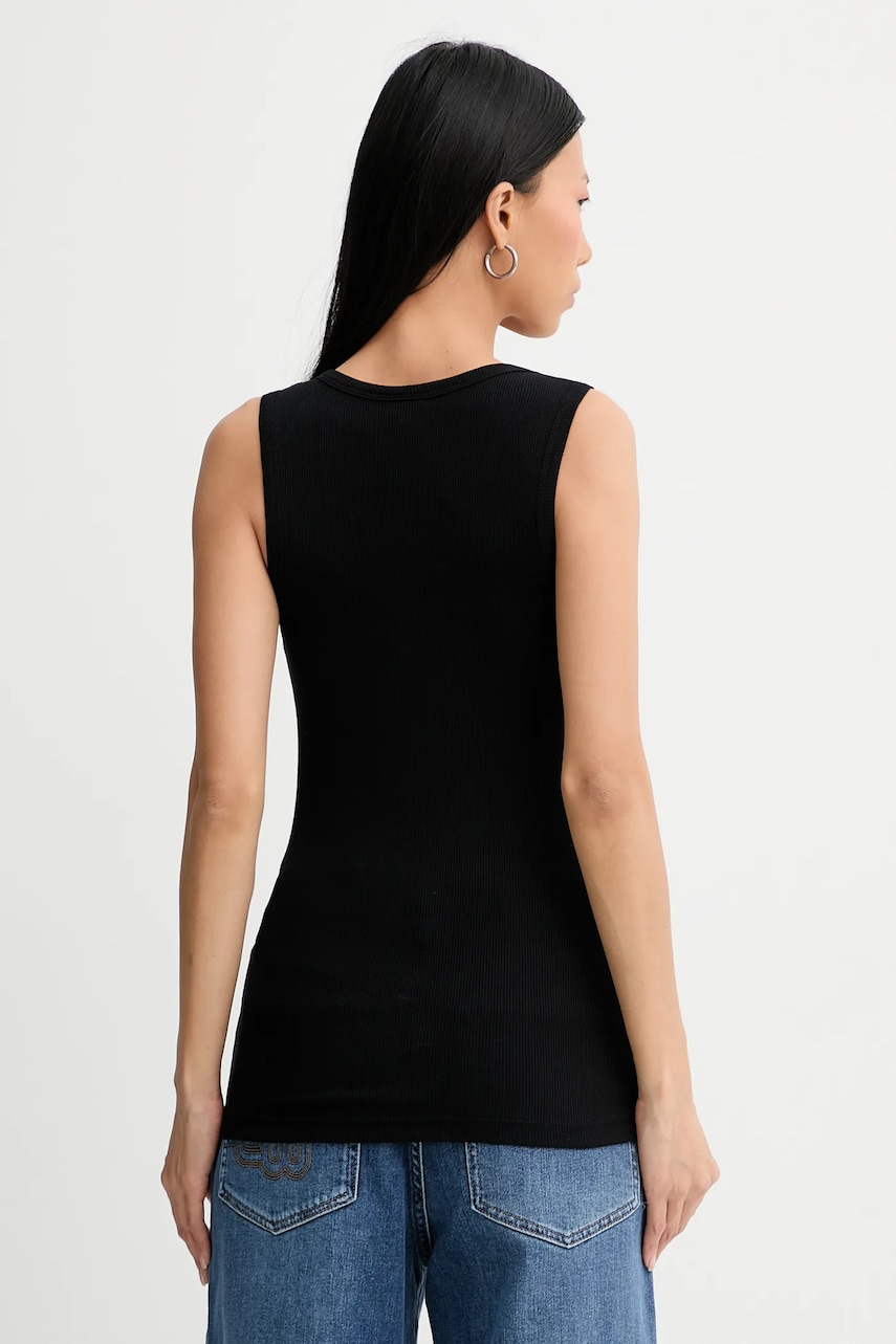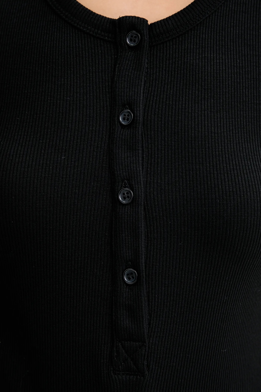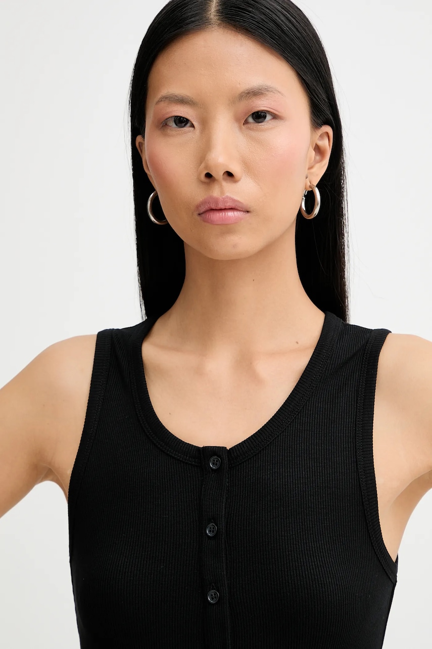 - Produkt częściowo wykonany z LENZING™ ECOVERO™ - materiału przyjaznego środowisku. Produkcja LENZING™ ECOVERO™ z ekologicznej celulozy i pulpy drzewnej wykorzystuje o 50% mniej wody w porównaniu do popularnej wiskozy. - Fason slim. - Okrągły dekolt. - Krótkie zapięcie na guziki. - Model bez rękawów. - Prążkowana dzianina. - Długość: 62 cm. - Szerokość pod pachami: 37 cm. - Wymiary podane dla rozmiaru: 36.