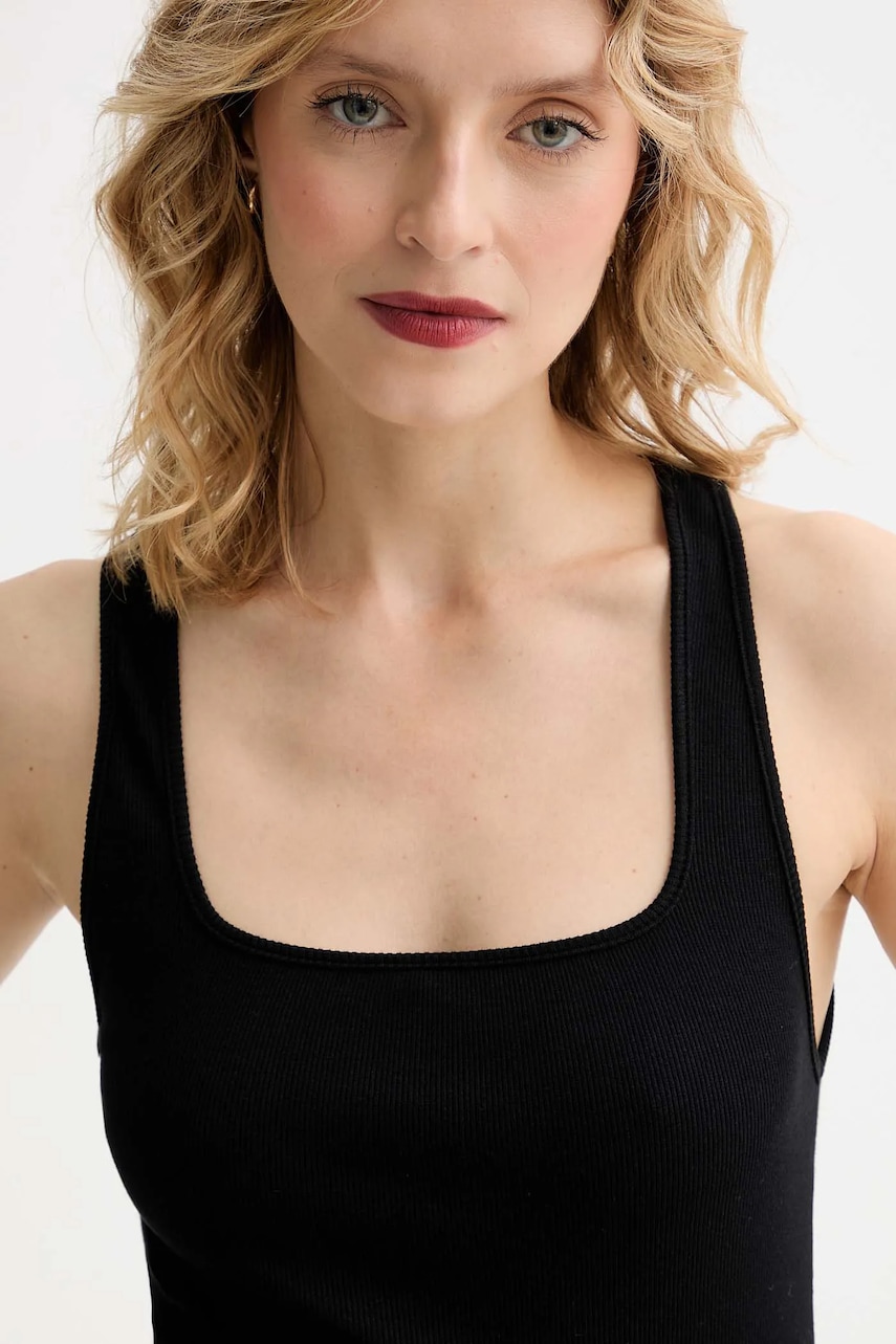 - Dopasowany, podkreślający sylwetkę fason. - Klasyczny, okrągły dekolt. - Cienka, elastyczna dzianina. - Długość: 60 cm. - Szerokość pod pachami: 33 cm. - Wymiary podane dla rozmiaru: S.