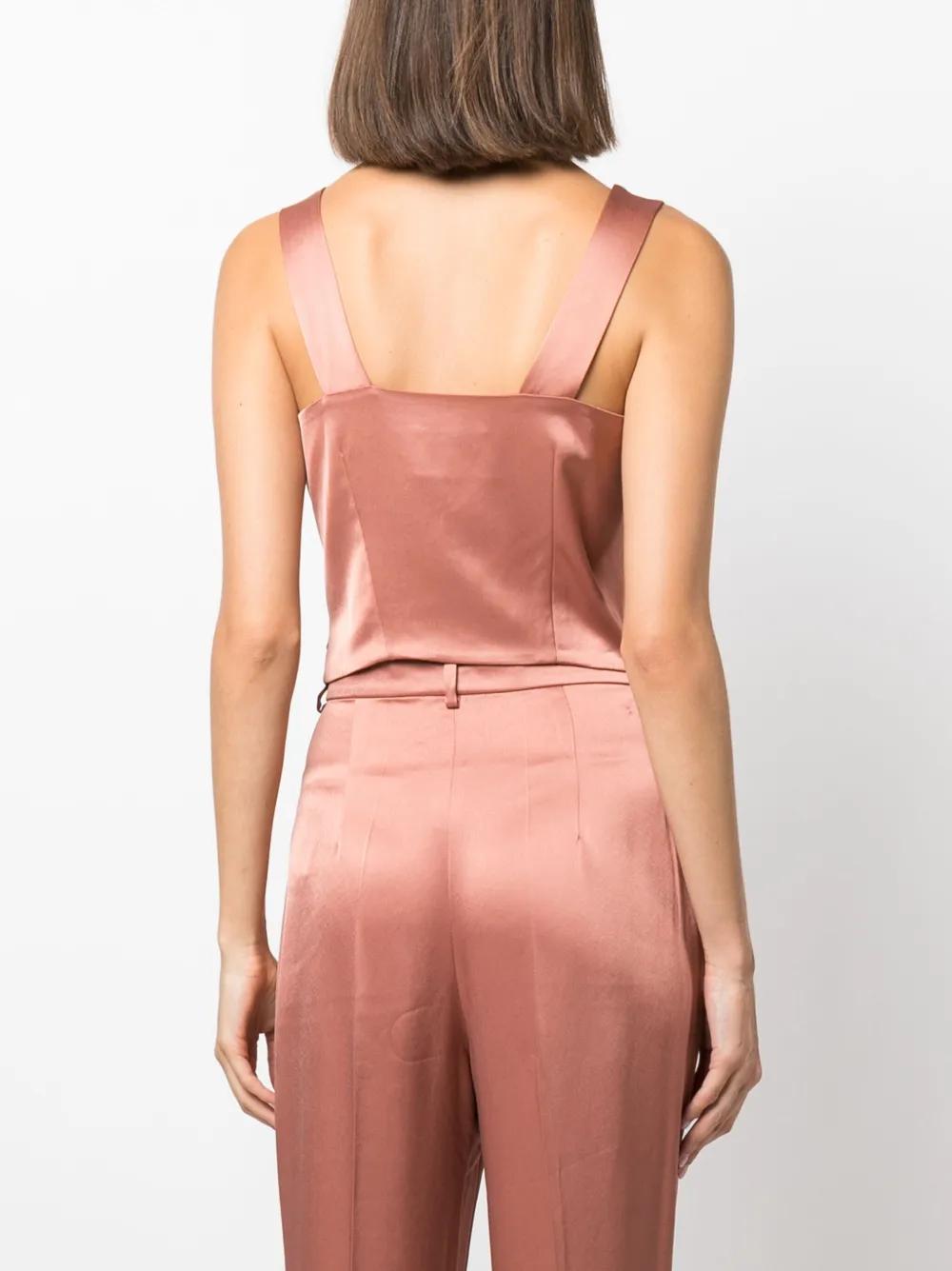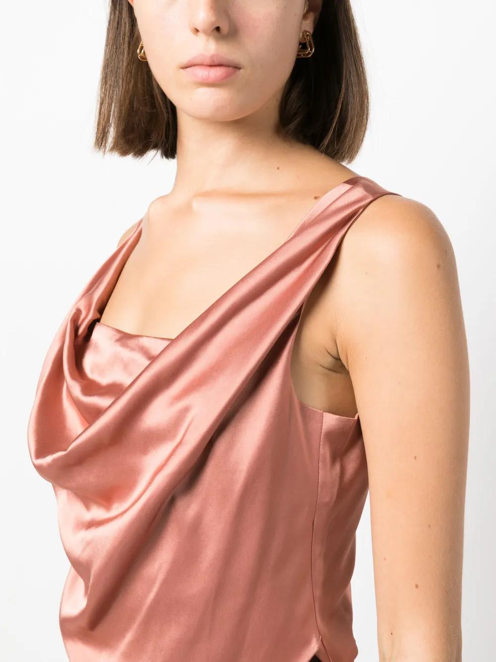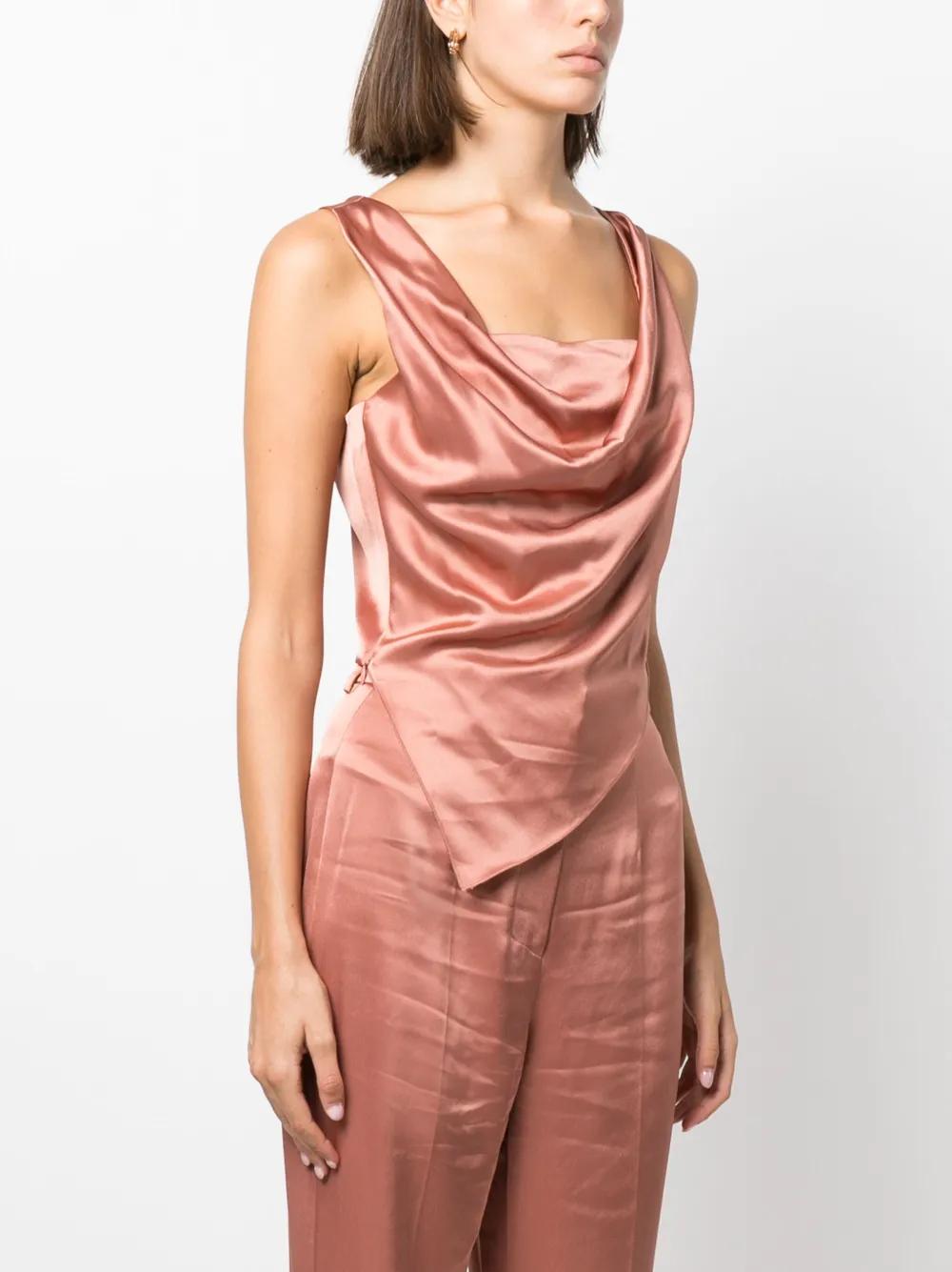 rose pink recycled polyester blend satin finish draped detailing sleeveless asymmetric design