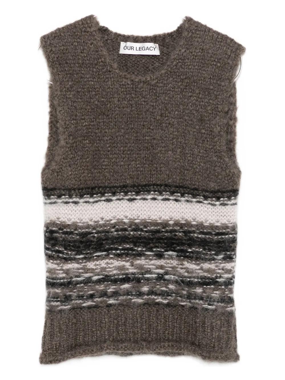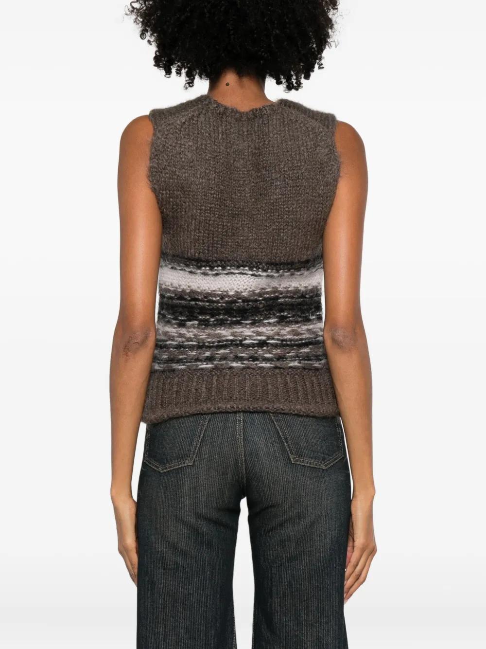 brown fair-isle pattern sleeveless round neck ribbed hem