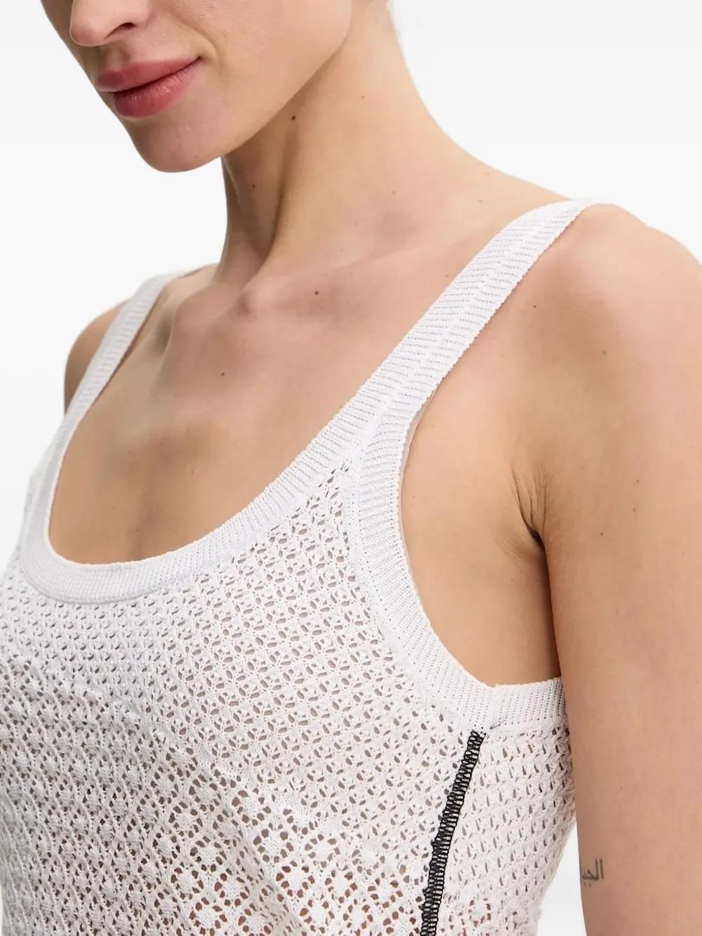 white open knit scallop hem sleeveless scoop neck logo label
