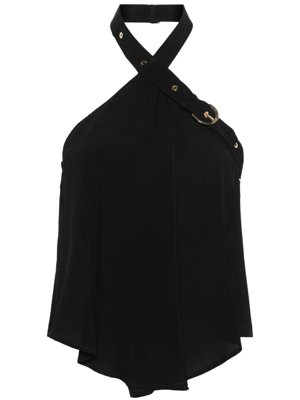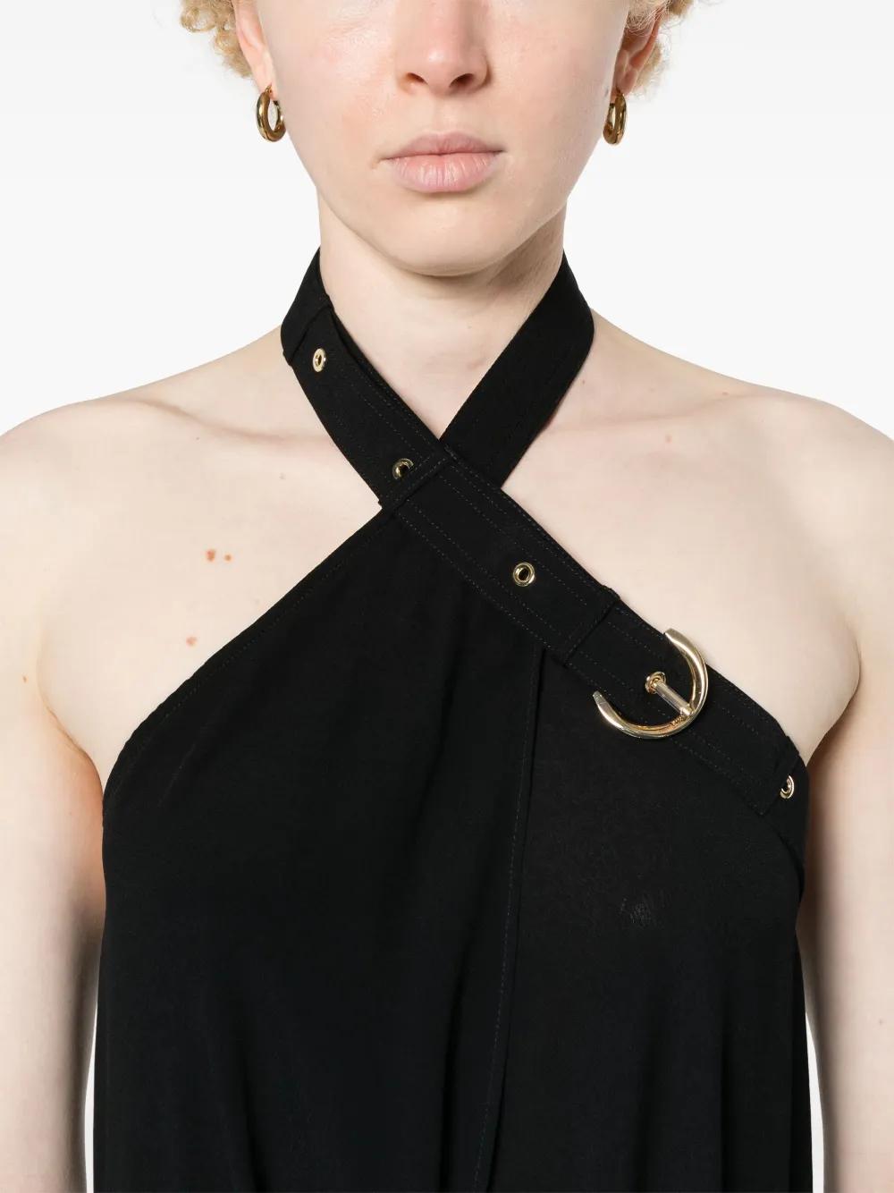 black crepe de chine halterneck open back curved hem unlined buckle-strap fastening