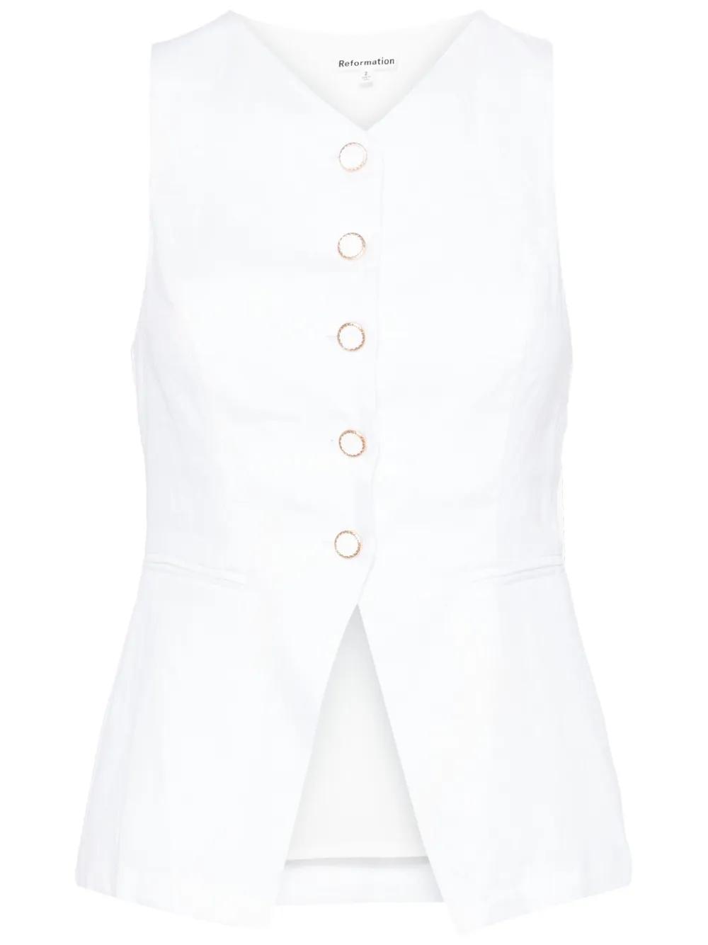 white organic cotton/linen V-neck front button fastening two side welt pockets sleeveless straight hem